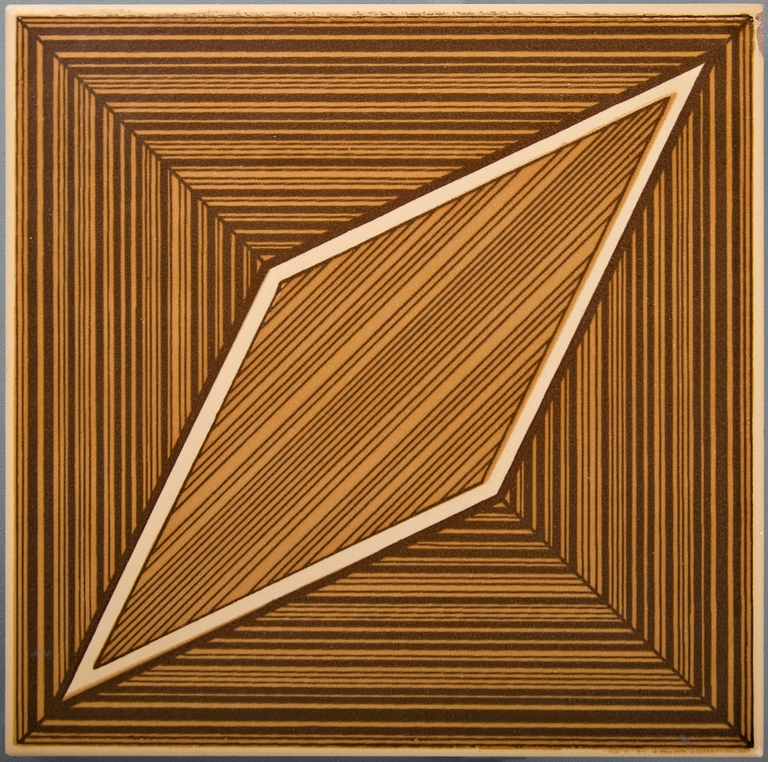 Biscotto per bicottura tradizionale. Piastrella decorata con rombo centrale e con motivi lineari ad imitazione del legno.