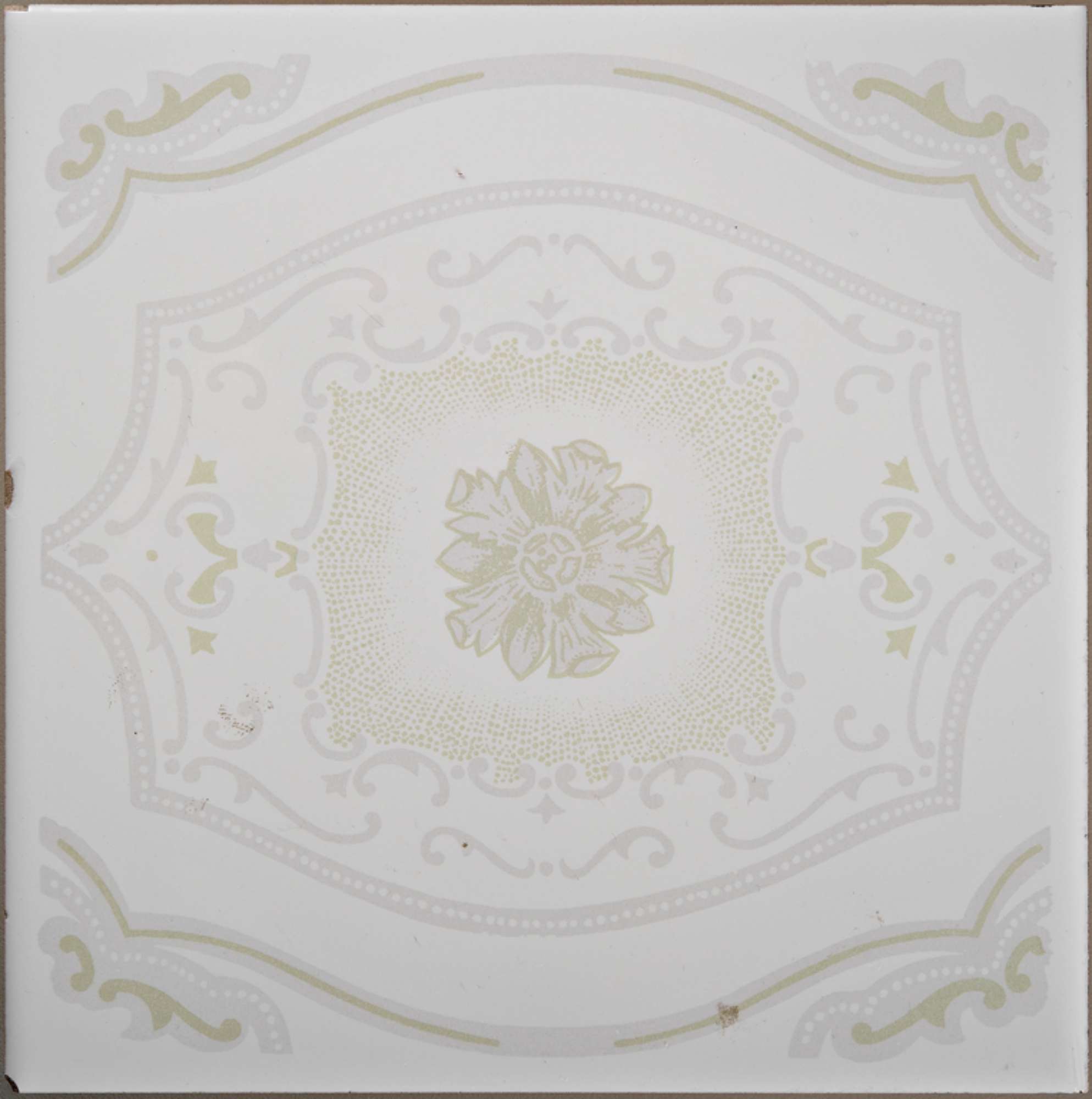 Piastrella smaltata e decorata a serigrafia con medaglione rocaille e rosone centrale.