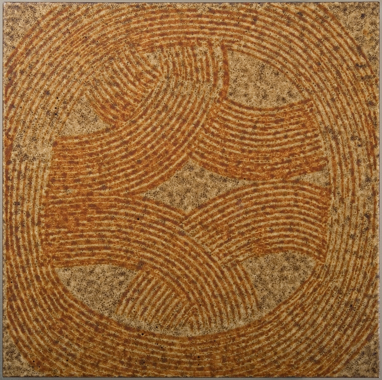 Piastrella decorata con un medaglione, formato da cerchi concentrici, che racchiude elementi ad archi incrociati.
