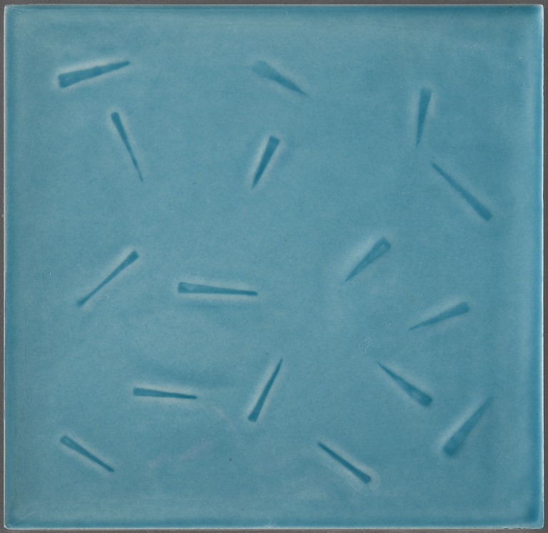 Cottoforte rosso, macinato a secco, cottura birapida in forno a rullo. Decorato con elementi cuneiformi su fondo verde-azzurro.