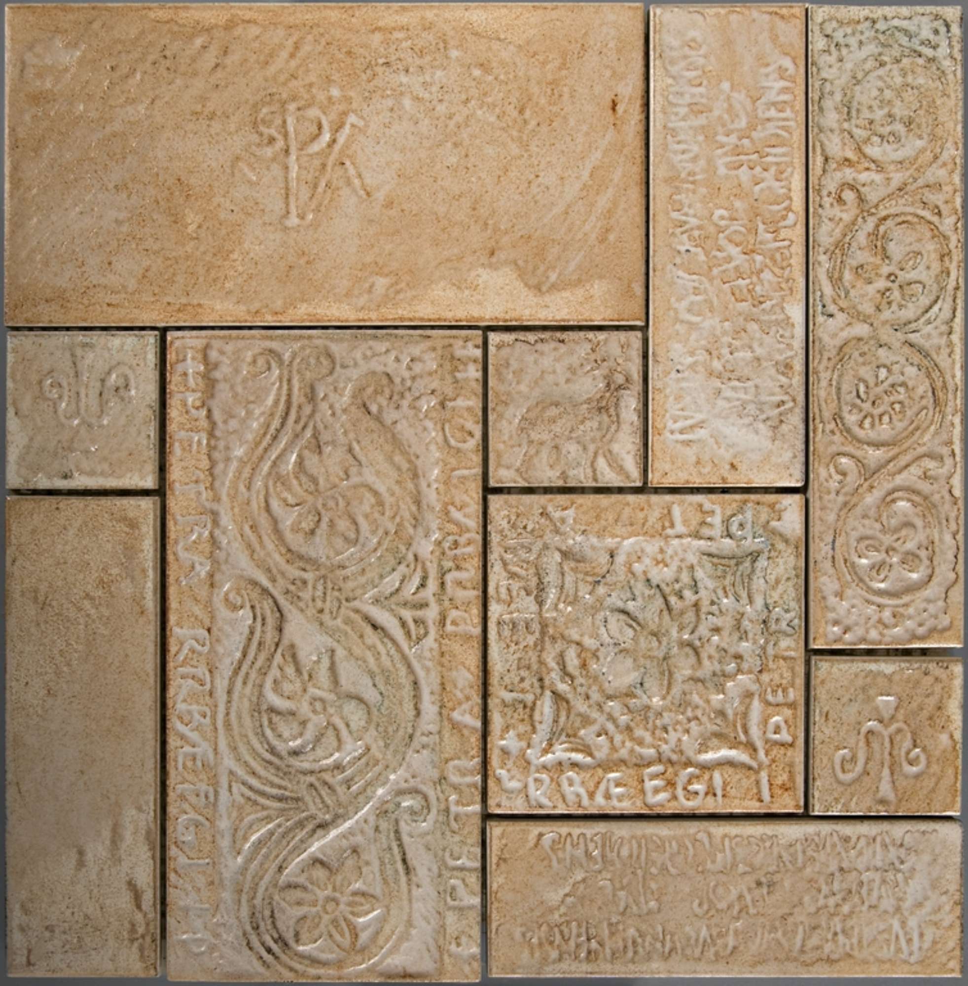 Piastrella a mosaico con listelli incisi con scritte e motivi floreali.