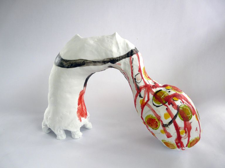 La scultura raffigura una figura amorfa arcuata graffita e dipinta con lunghe pennellate rosse e nere e cerchi policromi di diverse dimensioni.