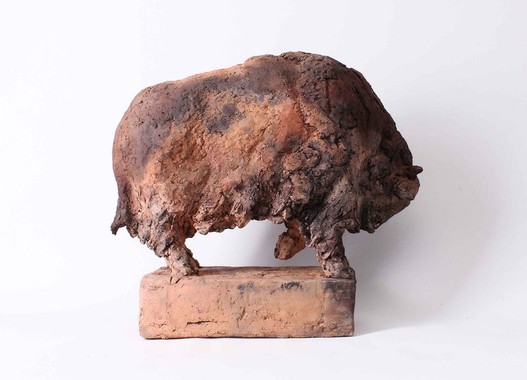 Scultura a forma di bue muschiato con muso chino e una zampa anteriore sollevata in posizione d'attacco. La scultura poggia su un'alta base rettangolare. Nella parte posteriore della base è incisa una civetta, il marchio dell'artista.