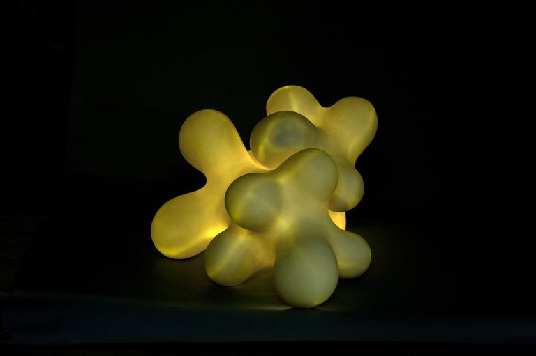 Scultura composta in due parti poste su una base in plexiglass. Le due sculture, dalle morbide forme arrotondate, riprendono nell'intenzione dell'artista dei coralli marini.