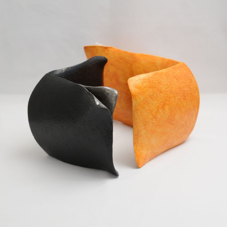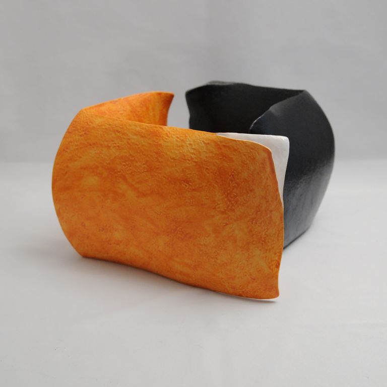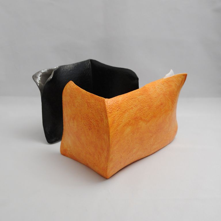 La scultura è composta da due opere in terra bianca dalla forma ad angolo, rivestite di ingobbi (tipo terra sigillata) e smalti. Un'opera è rivestita di nero, mentre l'altra è di color arancio. Entrambe le opere hanno un angolo in alto aperto in due labbri.