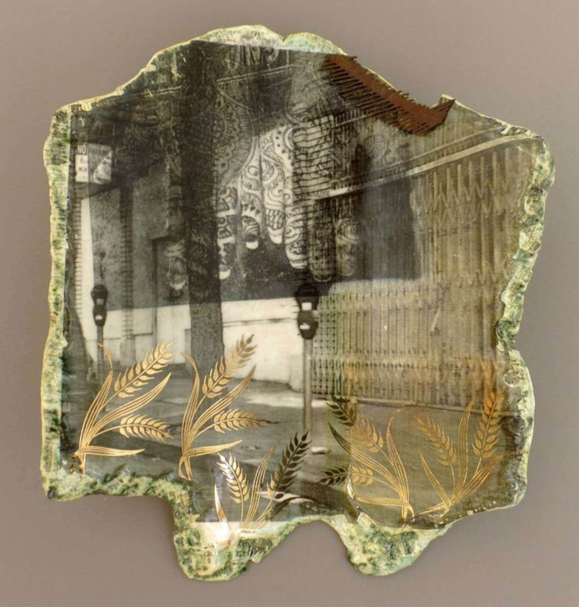 Pannello dal profilo irregolare decorato a decalcomania con la veduta di una strada con due parchimetri e la saracinesca di una vetrina, sopra alla prima decalcomania sono applicate altre due decalcomanie, una nella zona superiore, raffigurante due mani con tatuaggi mehndi, e una in basso con spighe di grano dorate.