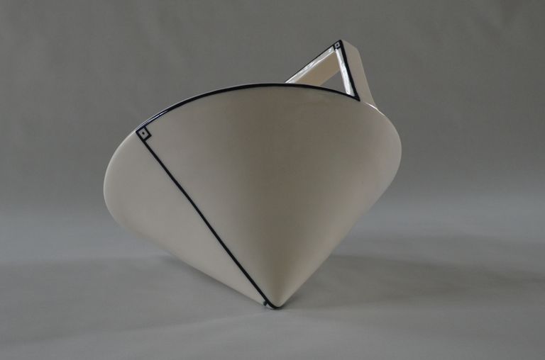 Teiera dalla forma a prisma triangolare, con manico squadrato posto in alto, piccolo beccuccio triangolare e tappo di sughero. Una linea nera segna parte del profilo della teiera.