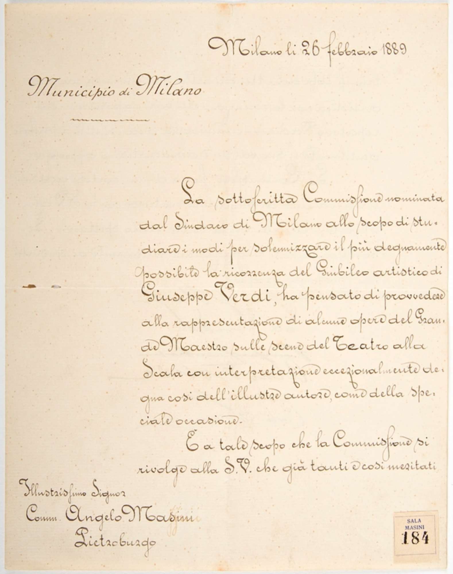 La lettera è scritta a penna con inchiostro nero su carta, sul fronte e sul retro del foglio. Il corpo del testo è per lo più aderente al margine destro, ad esclusione dell'intestazione del mittente, il Municipio di Milano, la data, ed il destinatario, quest'ultimo ubicato nell'angolo in basso a sinistra.