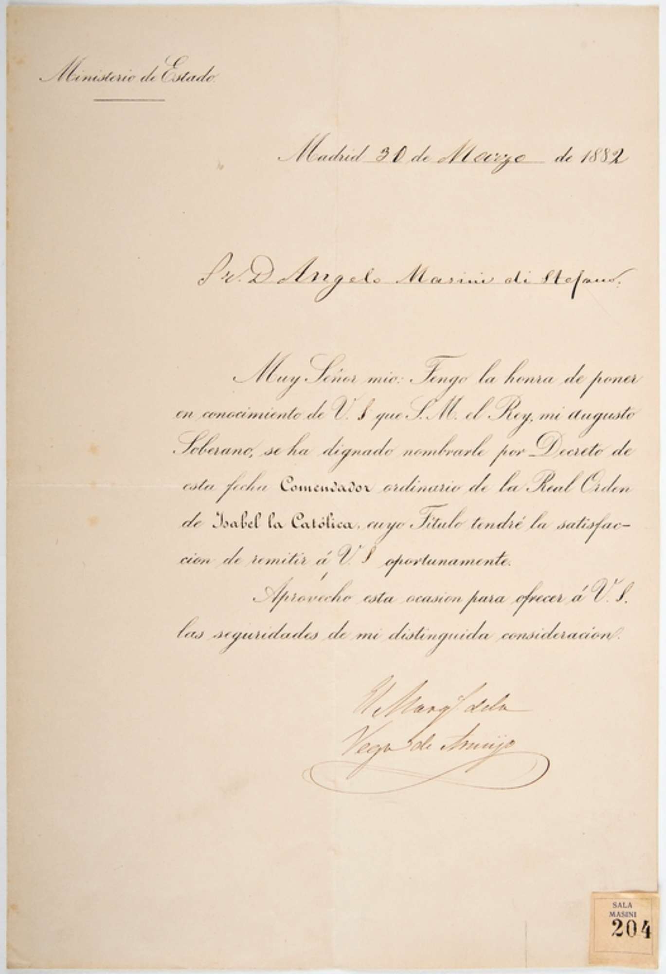 Trascrizione: Muy Señor mio: Tengo la honra de poner / en conocimiento de V. S. que S. M. el Rey, mi augusto / Soberano se ha dignado nombrarle por Decreto de / esta fecha Comendador ordinario de la Real Orden / de Isabel la Catolica, cuyo Titulo tendré la satisfac- / cion de remitir a V. S. oportunamente. / Aprovecho esta ocasión para ofrecer a V. S. / las seguridades de mis distinguidas consideración. Firma autografa solo parzialmente decifrabile: …de la Vega de… (?)