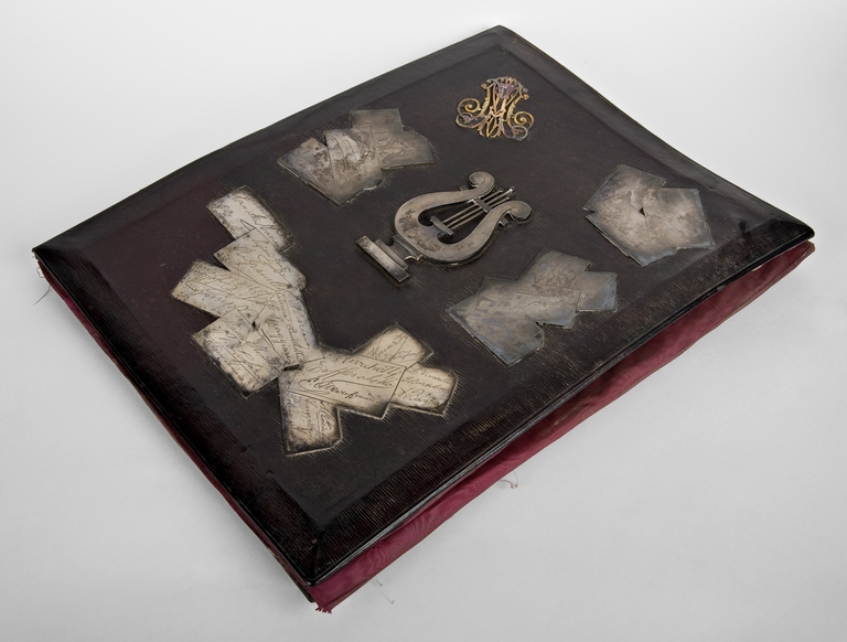 La cartella è in pelle marrone con rivestimento interno in seta rossa. Presenta applicazioni in argento e precisamente: una lira al centro con incisa la data 1893; una composizione di 4 gruppi di piastrine di metallo distribuite sotto, a destra e sinistra della lira, contenenti firme incise e la dedica a Masini dalla Società Italiana di Beneficenza di Mosca; un monogramma in argento dorato con le lettere A.M. nell'angolo in alto a sinistra. La cartella all'interno è vuota.