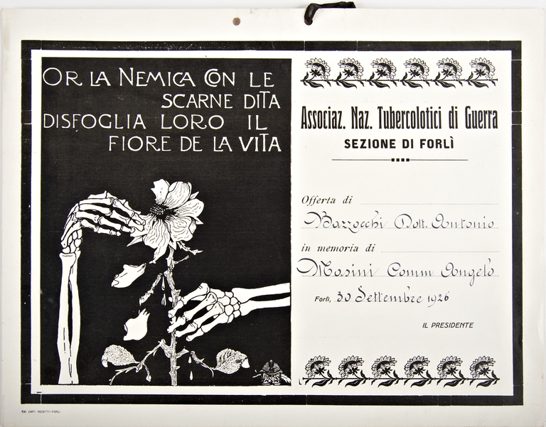 La pergamena presenta un bordo nero all'interno del quale lo spazio è diviso a metà tra sfondo nero a sinistra e fondo bianco a destra su sfondo bianco. Nella parte nera compare un'iscrizione poetica a caratteri bianchi sul tema della morte, sotto la quale l'immagine in bianco di un fiore i cui petali sono strappati dallo scheletro di due mani umane. Il testo è concentrato nella parte destra della pergamena. I caratteri sono prevalentemente a stampa, ad inchiostro nero, ad eccezione del nome del benefattore, di quello di Masini e della data, che sono stati inseriti a penna. La firma del presidente non è presente. Nell'angolo in basso a sinistra compare il nome della tipografia. Sul lato superiore, al centro sono presenti due fori ai quali è allacciato un fiocco di tessuto nero.
