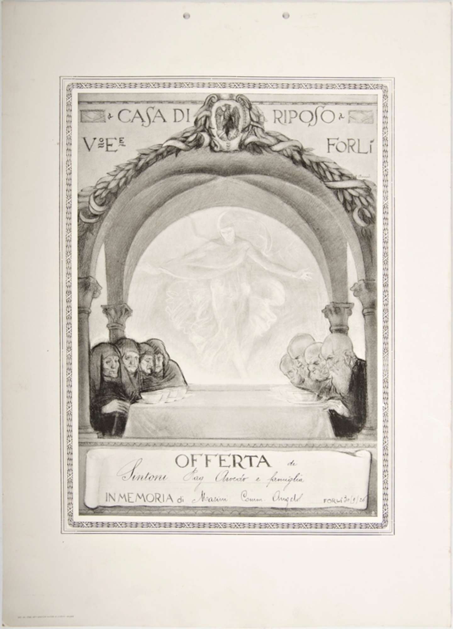 La pergamena presenta un margine bianco molto ampio all'interno del quale è presente il rettangolo grafico bordato a motivi geometrici che contiene la targa vera e propria. L'intestazione dell'istituto beneficiario compare in alto a caratteri maiuscoli, a destra e a sinistra dell'immagine principale di quattro anziane velate e quattro uomini anziani calvi seduti le une di fronte agli altri, con stoviglie innanzi a ciascuno. La scena è ambientata sotto una volta a crociera, aperta su tutti e quattro i lati, sul cui arco di facciata è installato un festone vegetale con lo stemma della città di Forlì in chiave. Sullo sfondo compare un'apparizione sacra in lontananza, a toni appena accennati. Il testo è concentrato in un riquadro sottostante l'immagine principale. I caratteri sono prevalentemente a stampa, ad inchiostro nero, ad eccezione del nome del benefattore, di quello di Masini e della data, che sono stati inseriti a penna. Nell'angolo in basso a sinistra del margine bianco esterno compare il nome della tipografia. Sul lato superiore, al centro sono presenti due fori.