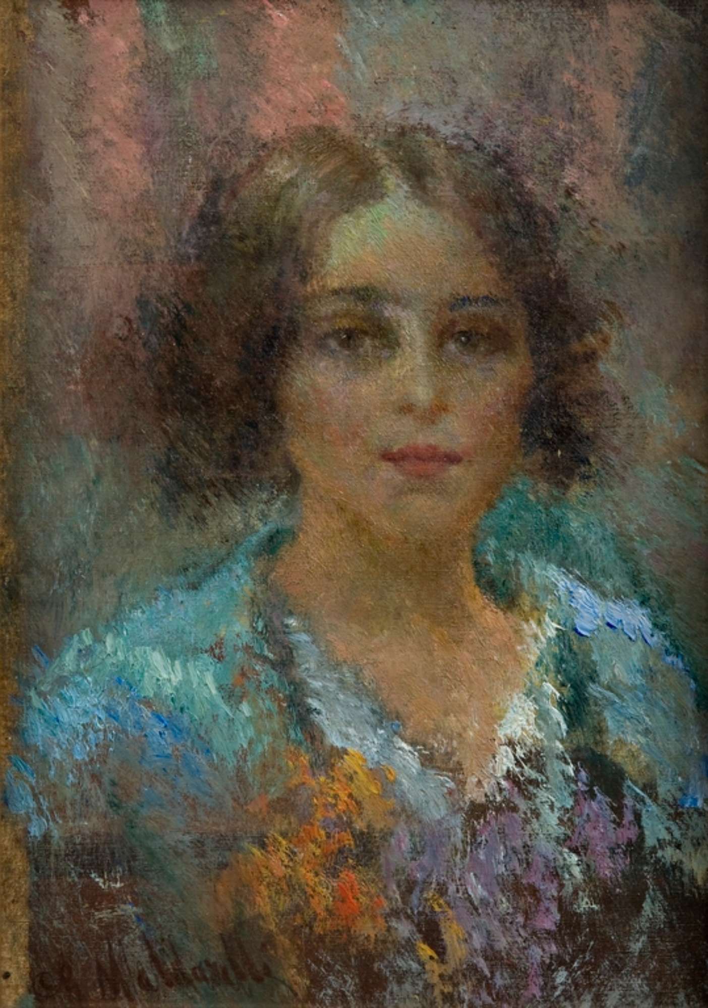 Il ritratto rappresenta una giovane donna a mezzobusto, in posizione frontale, con abito scollato a toni delicati dell'azzurro, dell'arancio e del viola. Il volto presenta un'espressione malinconica. Lo sfondo e tutto l'intorno sono resi tramite forme e contorni meno definiti. Le pennellate sono piccole e rapide e la gamma cromatica molto composita. L'opera è montata su cornice lavorata di legno dorato.