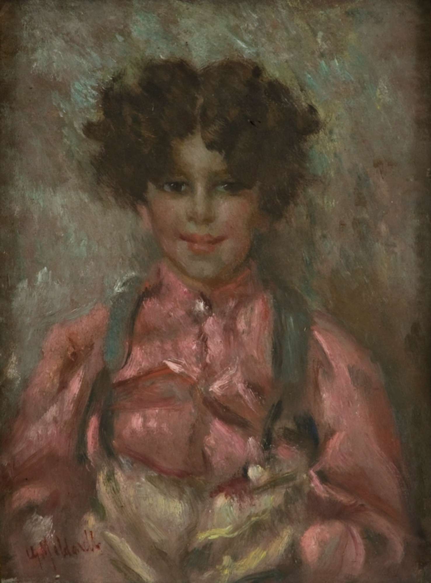 Il ritratto rappresenta un fanciullo a mezzobusto, in posizione frontale con le mani in tasca, camicia rossa, bretelle e pantaloni chiari. Il volto presenta un'espressione sorridente, con un accento cromatico particolare sulle labbra. I capelli sono voluminosi, ricci e scomposti. Lo sfondo neutro e gli abiti sono resi tramite forme e contorni poco definiti. Le pennellate sono piccole e rapide e la gamma cromatica molto composita. L'opera è montata su grande cornice lavorata di legno dorato.