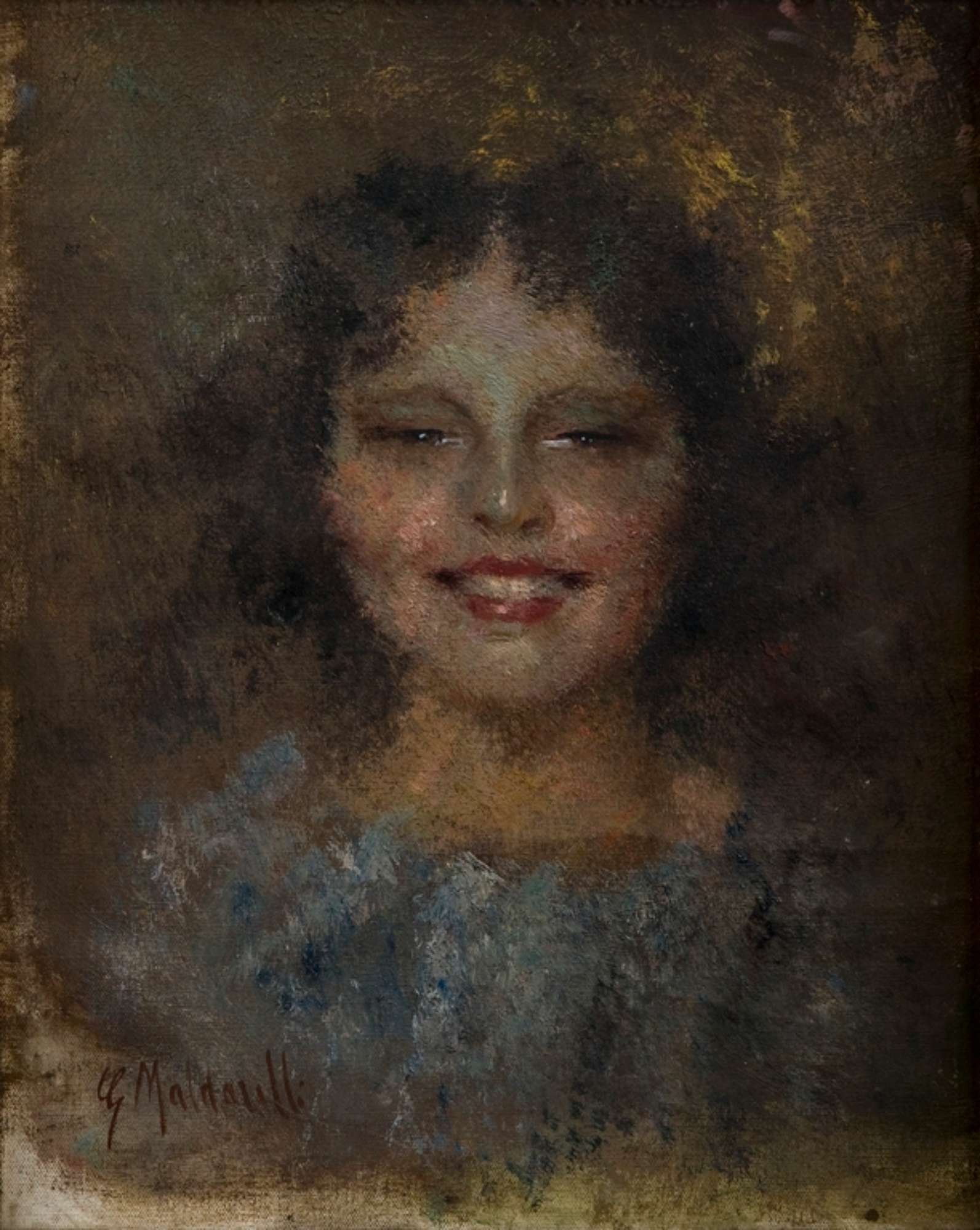Il ritratto rappresenta una giovane donna a mezzobusto, in posizione frontale, con abito azzurro, appena accennato. Il volto presenta un grande sorriso, con labbra rosse particolarmente marcate. Le luci nell'espressione dei lineamenti degli occhi socchiusi, della bocca, del naso e delle gote sono puntualmente molto evidenti. I capelli sono scuri e mossi e vanno a confondersi con lo sfondo e tutto l'intorno tramite forme e contorni meno definiti. Le pennellate sono piccole e rapide e la gamma cromatica molto composita. L'opera è montata su cornice lavorata di legno dorato.