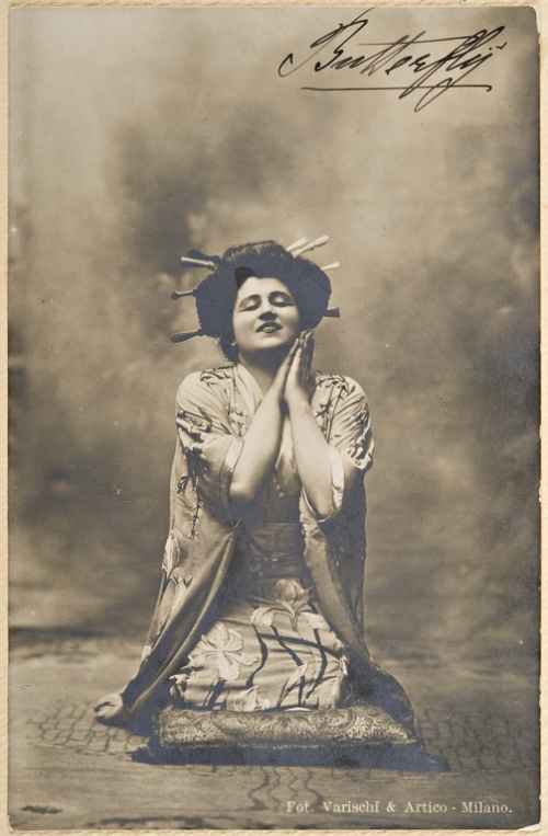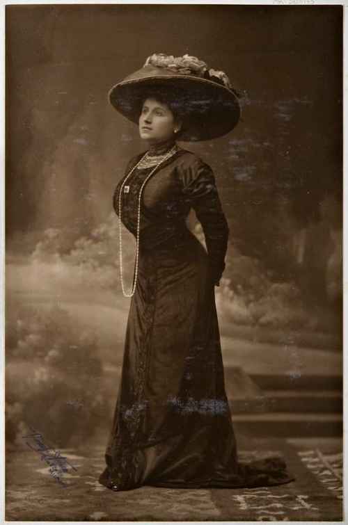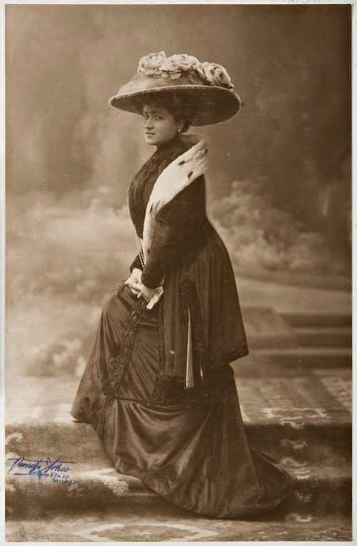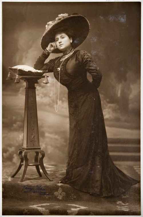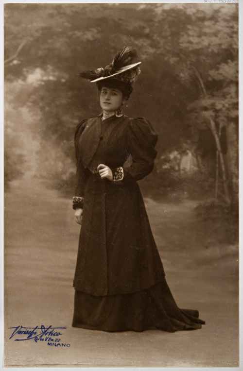 Si tratta di un fotoingrandimento che ritrae Maria Farneti a figura intera, di tre quarti, in abito elegante. La fotografia è in bianco e nero. Il soggetto si staglia su uno sfondo architettonico non ben definito, in cui si riconosce un arco. L'abito è chiara espressione del gusto liberty, con tessuto decorato a motivi orientali e un ampissimo strascico che occupa tutta la parte sinistra dell'immagine in basso. Infatti anche la posa e la composizione dello scatto sono di chiaro gusto nouveau. La figura dell'artista si erge statuaria sul lato destro, mentre l'abito le scende voluttuosamente sul corpo e se ne distacca in linee morbide e avvolgenti nella parte terminale. L'artista indossa una lunga collana di perle e sull'acconciatura sfoggia una piuma. La fotografia è montata su una larga cornice di legno dorato. Nella parte inferiore della foto compare una didascalia scritta a mano con il nome del soprano.