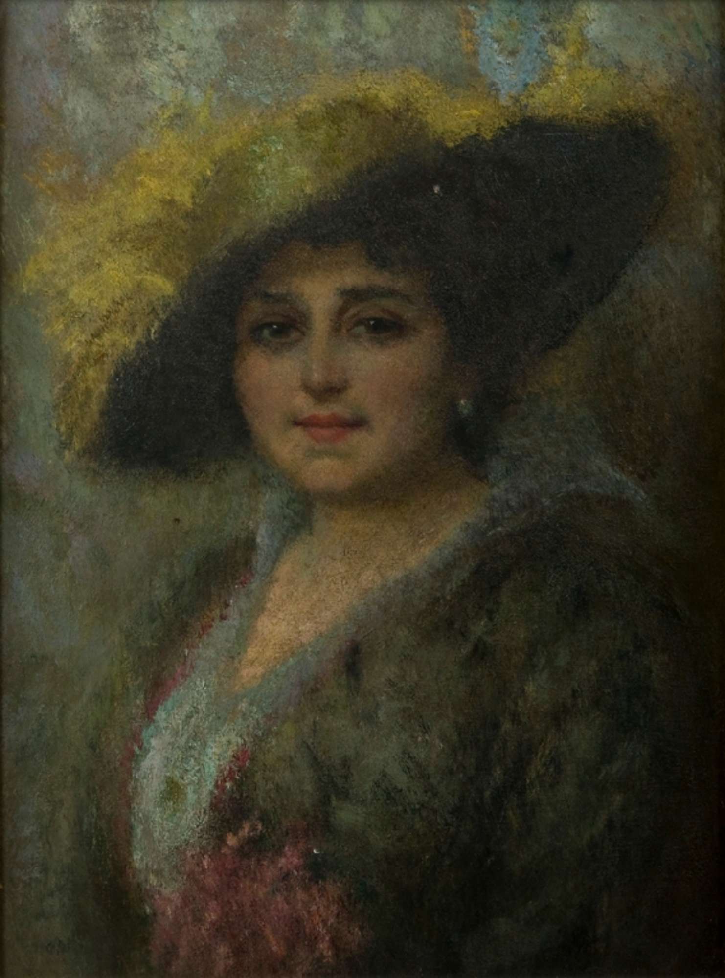 Il ritratto rappresenta una giovane donna a mezzobusto, orientata di tre quarti, con abito dal tono verde scuro. Sulla scollatura compaiono macchie di colore bianco, che sembrano evidenziare una camicia, e rosse. Il volto risulta la parte più dettagliata e definita del dipinto, nello sguardo, nella definizione dell'incarnato e della bocca, negli orecchini. Il capo è caratterizzato da un grande cappello a falde, anch'esso sui toni del verde, che tende a confondersi con lo sfondo, dall'aspetto meno definito. Le pennellate sono piccole e rapide e la gamma cromatica molto composita. L'opera è montata su cornice lavorata di legno dorato.