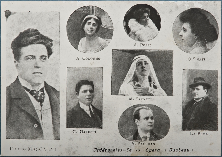Il ritaglio di giornale, montato su cornice di legno laccato bianco con filetto verde e oro, raccoglie alcune foto degli interpreti principali della prima rappresentazione assoluta dell'opera Isabeau di Pietro Mascagni. Le fotografie sono tutte di forme e dimensioni diverse, e quella del compositore, la prima a sinistra, è più grande delle altre. Ciascuna reca la didascalia con il nome dell'artista. Da sinistra: Pietro Mascagni, Amalia Colombo, Carlo Galeffi, Maria Pozzi, Maria Farneti, Antonio Saludas, Olga Simzis e Giuseppe La Puma. In basso compare un'iscrizione didascalica in lingua spagnola.