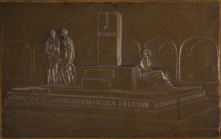 Targa del medaglista fiorentino Carlo Rivalta (1887-1941) che riproduce il Monumento ai Medici Italiani Caduti nella Guerra 1915-18, opera dello scultore ferrarese Arrigo Minerbi (1881-1960). Il monumento si trova nel Chiostro della Sanità Militare a Firenze, all’interno di quello che fu un tempo il convento di suore domenicane intitolato a San Domenico nel Maglio; il complesso conventuale venne definitivamente soppresso nel 1866, divenendo prima lazzaretto, poi caserma di bersaglieri, quindi sede della Scuola di applicazione di Sanità Militare. Al centro del cinquecentesco chiostro maggiore del complesso fu eretto nel 1924 il monumento di Minerbi per commemorare i medici italiani morti nella Grande Guerra: per le sue figure in bronzo fu simbolicamente impiegato il metallo dei cannoni austriaci fuso assieme alle decorazioni degli ufficiali medici. Proprio per rendere visibile dalla strada quest'opera fu inoltre abbattuto il quarto lato originario del chiostro, che venne sostituito sempre nel 1924 da una lunga cancellata in ferro, ideata dall’artista Giovanni Malmerendi e realizzata presso la fonderia Matteucci di Faenza.