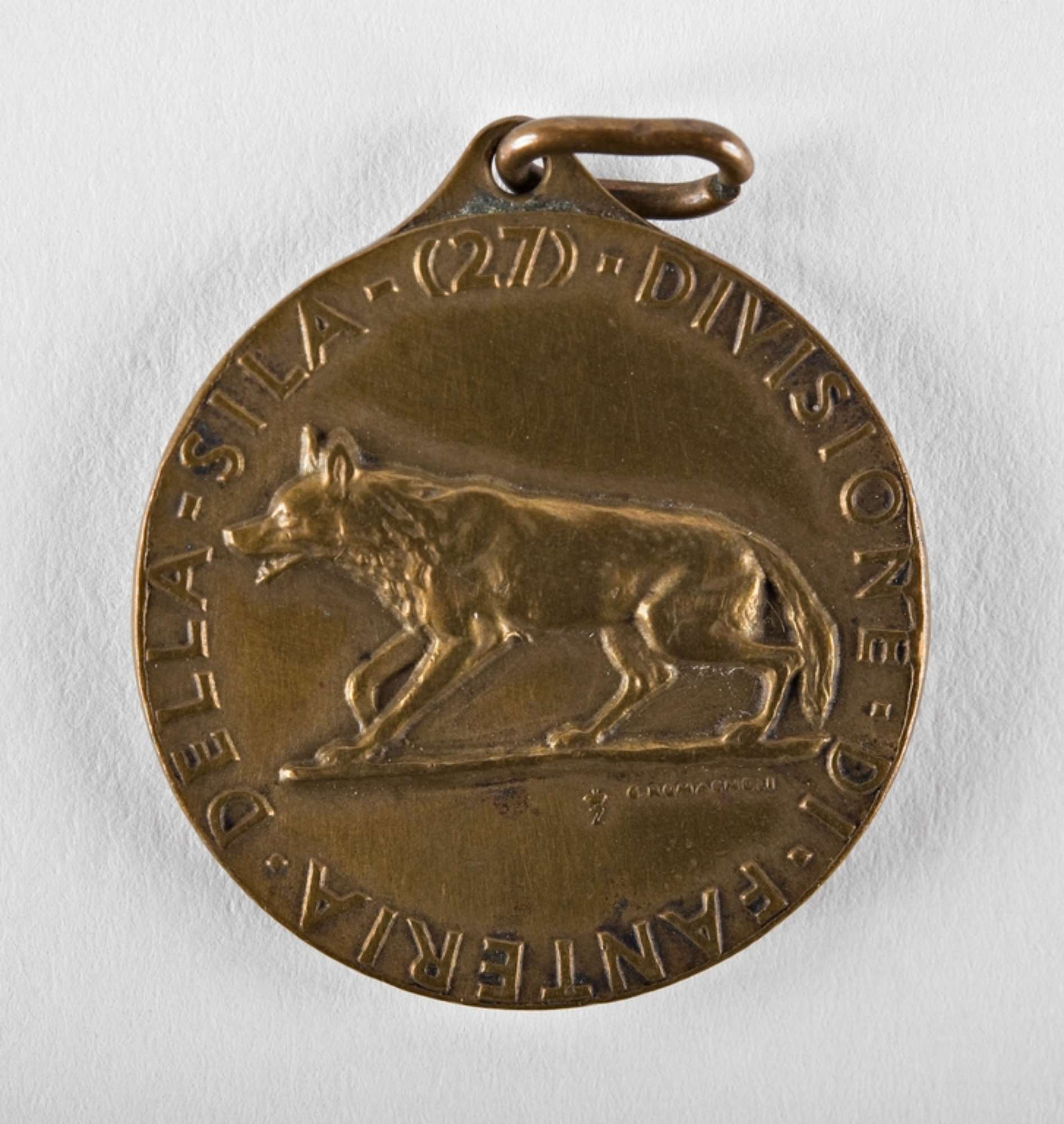Medaglia commemorativa della 27° Divisione Fanteria “Sila”, unità del Regio Esercito italiano che venne impegnata nella campagna in Africa Orientale tra il 1935 e il 1936. Creata il 1 gennaio 1935 con sede a Catanzaro, la divisione era costituita da tre reggimenti di Fanteria, il 19° (Catanzaro), il 20° (Reggio Calabria) e il 16° (Savona), più il 55° reggimento di Artiglieria (Nola). La divisione fu mobilitata e trasferita in Eritrea il 20 settembre 1935 e da lì impiegata nei più importanti scontri della Guerra d’Etiopia, tra cui quello svoltosi nei dintorni dell’altopiano dell’Amba Aradam a cui fa riferimento la medaglia in esame. Rientrata in patria nell’ottobre del 1936, l’unità esistette fino al 24 maggio 1939 quando fu rinominata 27° Divisione di Fanteria “Brescia”. La medaglia commemorativa, che riporta sul rovescio l'effigie del lupo, emblema dell'Altopiano Silano, fu realizzata dallo scultore e medaglista Giuseppe Romagnoli (1872-1966) e coniata presso la Regia Zecca di Roma. Essa non era dotata di un nastro specifico, ma chi la riceveva poteva decidere come personalizzarlo, di solito con i colori del proprio reggimento d’appartenenza.