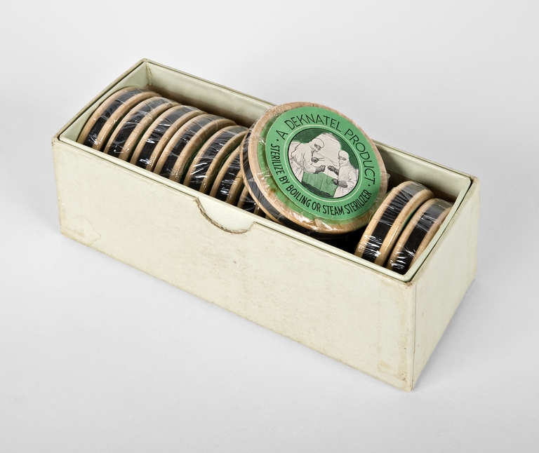 Descrizione: etichetta verde con raffigurati due medici in sala operatoria e la scritta A DEKNATEL PRODUCT STERILIZE BY BOILING OR STEAM STERILIZER