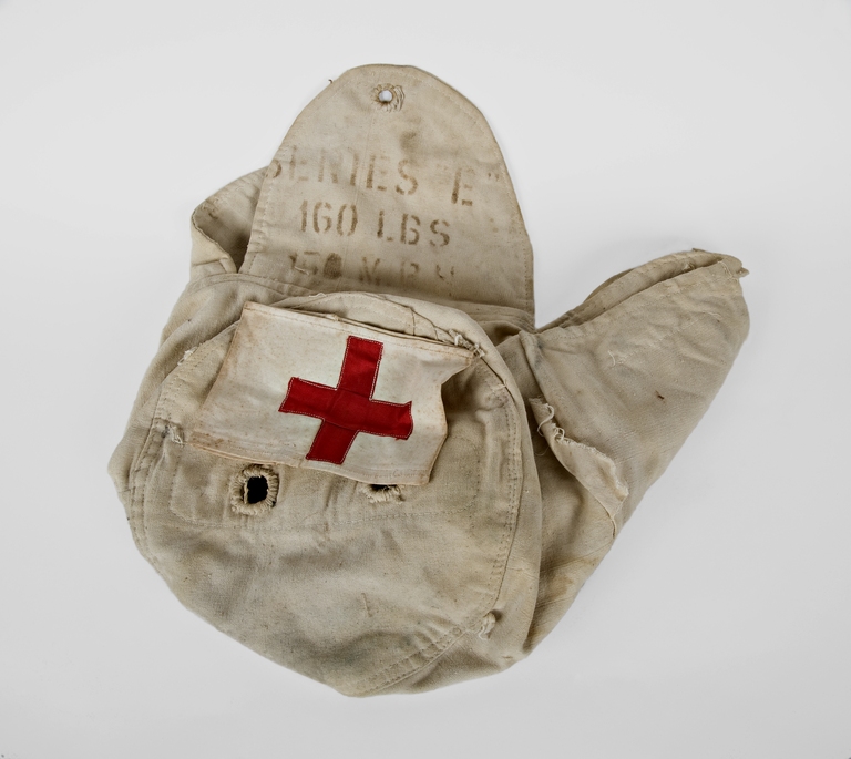 La sacca per paracadute in tela bianca ha diversi passanti che servivano per la chiusura che avveniva attraverso la "fune di vincolo".