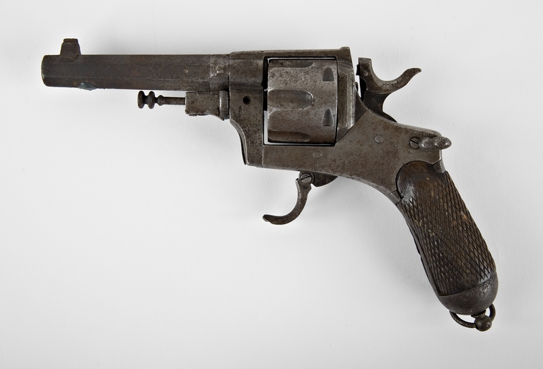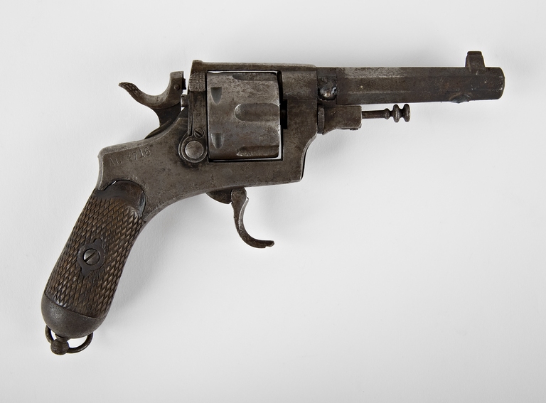Pistola a tamburo (o a rotazione) Bodeo-Glisenti mod. 1889, calibro 10,35 mm, matricola AL4716, con canna esterna ottagonale, castello del "tipo chiuso" ricavato in un unico pezzo con l'impugnatura; funzionamento: revolver a doppia azione; alimentazione: tamburo a sei colpi; velocità iniziale: 250 m/s.