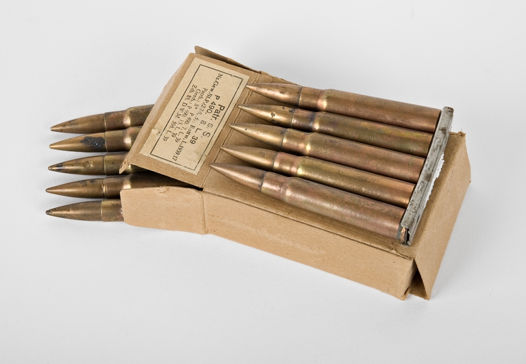 Cartuccia 7.92X57 mm (7.92 mm o 8mm Mauser o 8X57 mm) M/OS tipo S per fucile Mauser 98K. Ha il bossolo in ottone con scanalatura per la presa dell'estrattore di tipo Rimless, forma a collo di bottiglia e innesco di tipo Berdan. La palla è in lega al 72% di rame e al 28% di zinco. Le cartucce sono inserite in un caricatore da cinque colpi costituito da una piastrina con nervatura di trattenimento dei colpi.