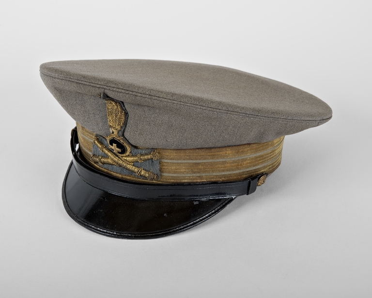 Berretto rigido da ufficiale composto da una fascia cilindrica e di una parte superiore, sporgente rispetto alla fascia. Il davanti della parte sporgente era chiusa da un piatto. La fascia del berretto è in cordellino grigio verde. Tutto intorno alla fascia è riportato il distintivo di grado in forma di galloni d'oro. Ha una visiera tondeggiante in cuoio nero lucido, leggermente inclinata e sporgente rispetto alla fascia. Il sottogola, in cuoio nero lucido, è fissato alla fascia del berretto da due bottoncini dorati, semibombati, ornati di una cornice a tortiglione e dal fregio del'arma, corpo o servizio.