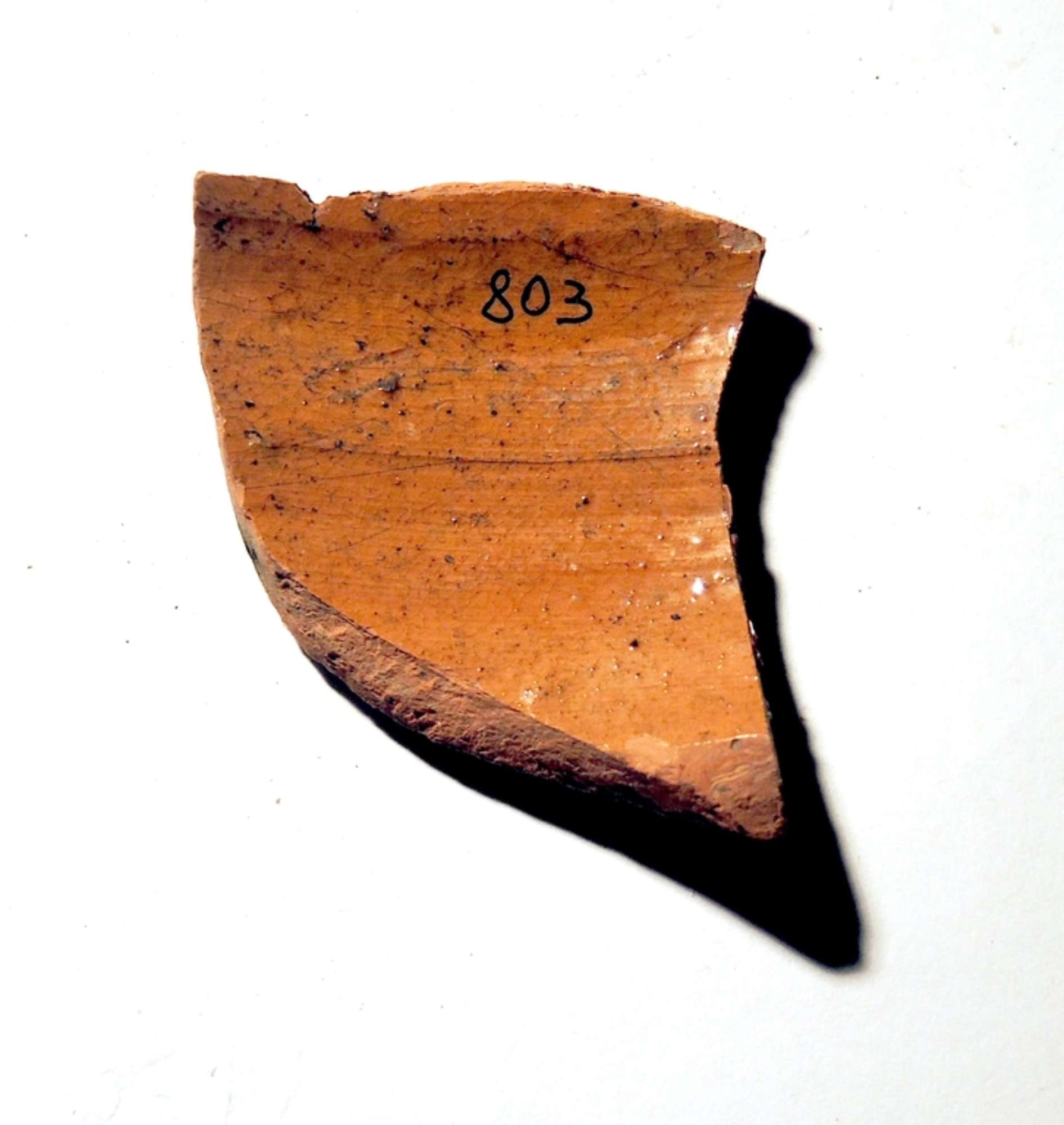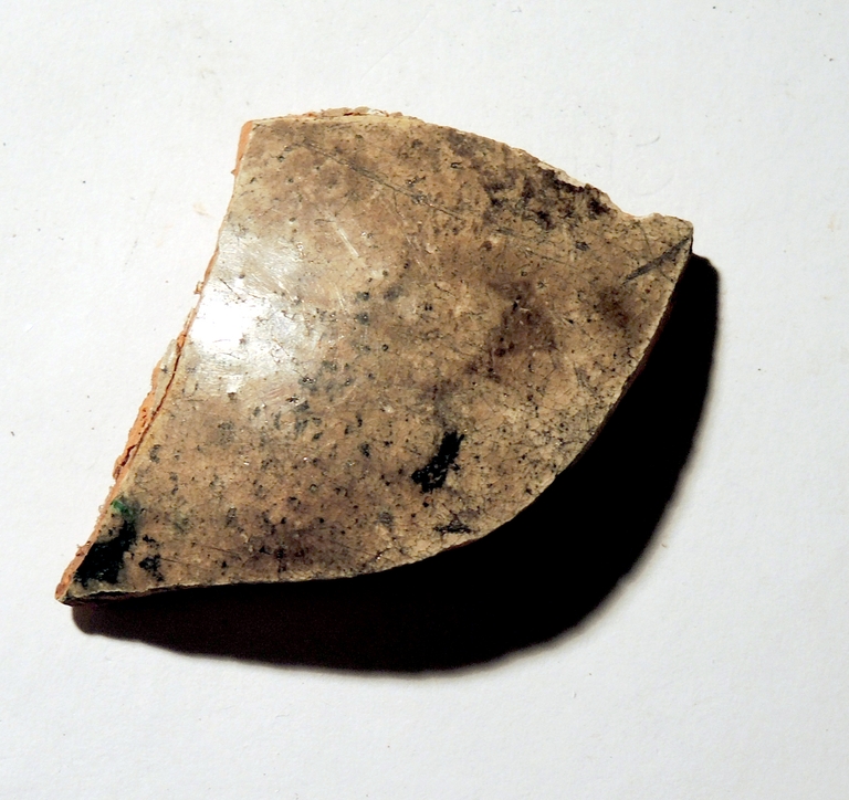 Frammento di corpo di forma chiusa. Motivo vegetale indecifrabile. Dipinto in verde ramina e giallo ferraccia.