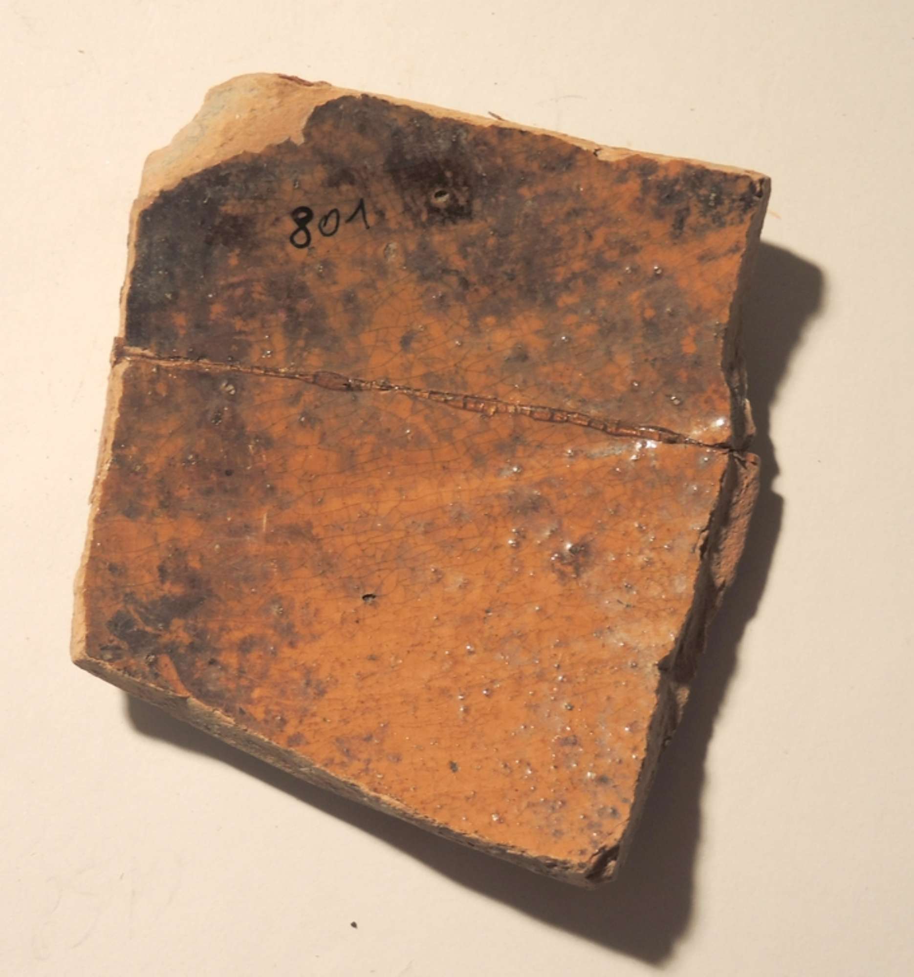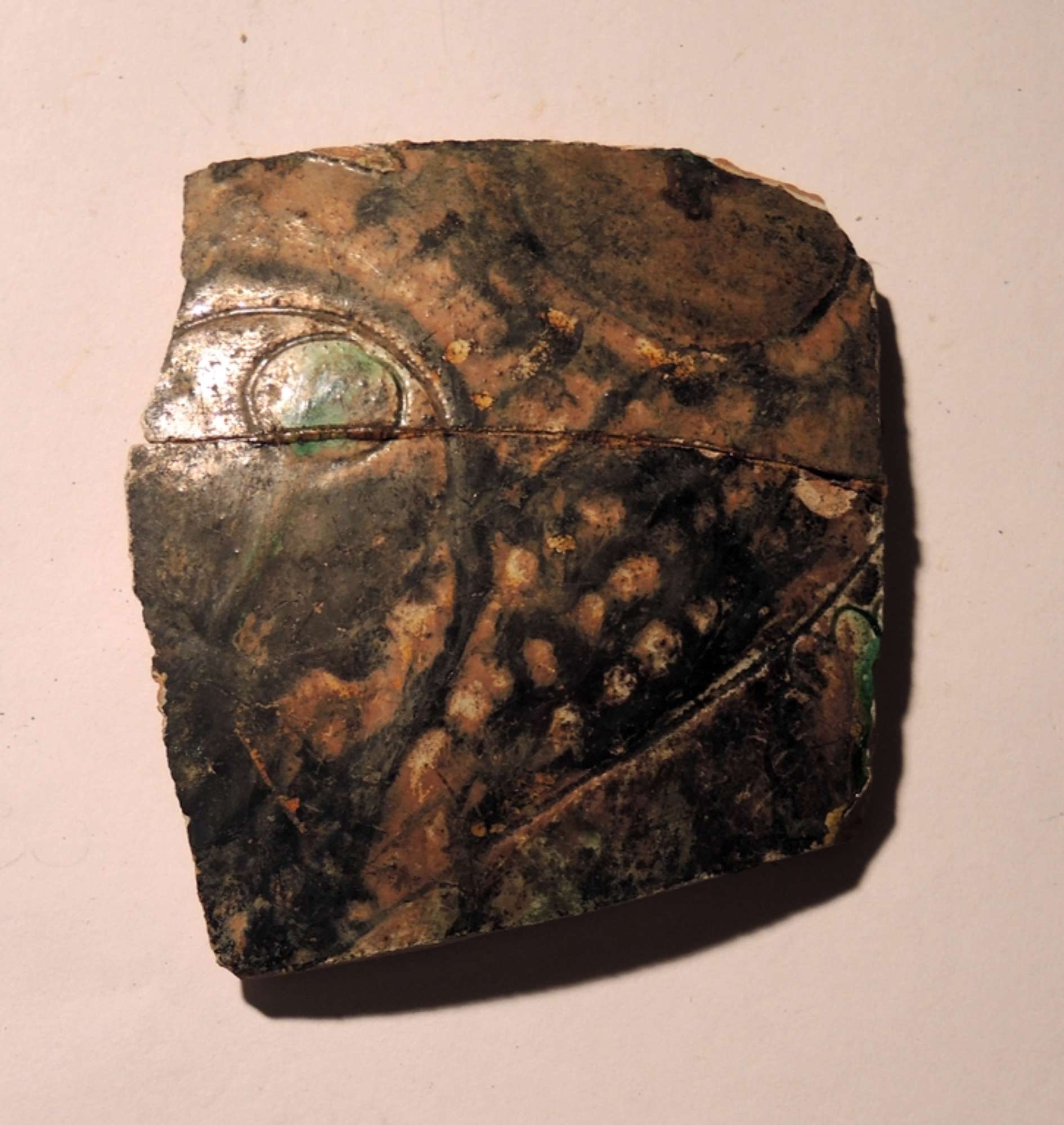 Frammento di forma chiusa. Motivo vegetale indecifrabile. Dipinto in verde ramina e giallo ferraccia.