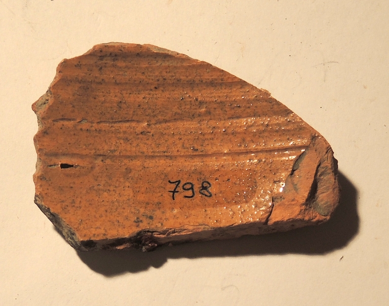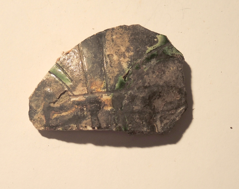 Frammento di forma chiusa decorato con giglio araldico. Dipinto in verde ramina e giallo ferraccia.