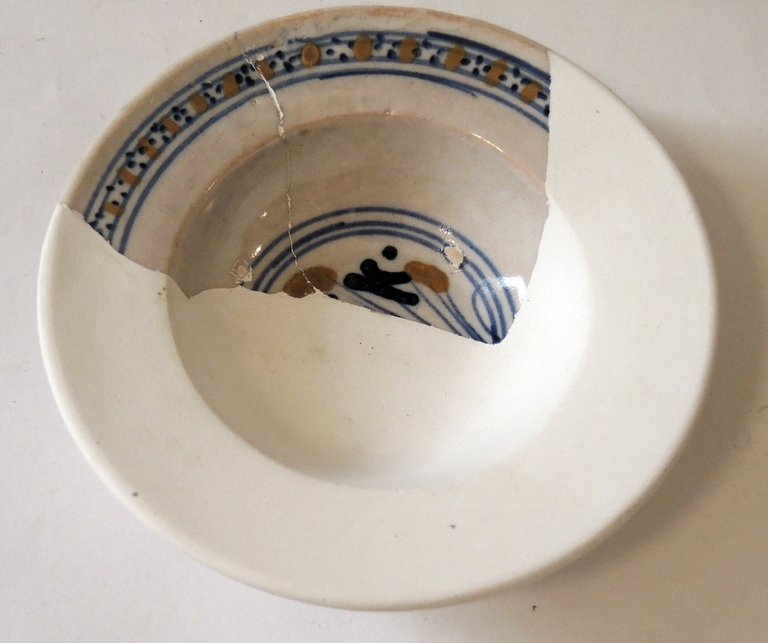 Frammento di piccola scodella con orlo semplice, tesa inclinata, cavetto emisferico, apoda con base concava. Sulla tesa fascia con piccoli fiori azzurri separati da segenti gialli; al centro del cavetto motivi vegetali stilizzati in azzurro e giallo.