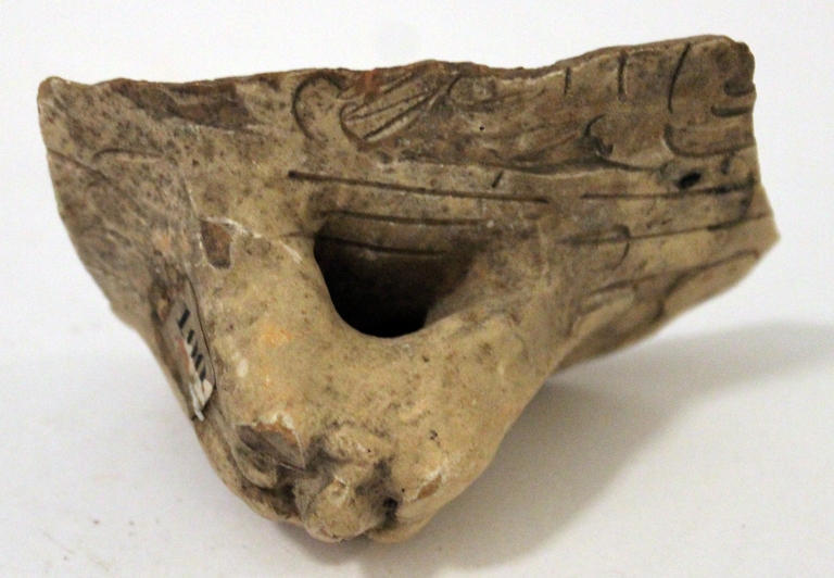 Frammento di fiasca con corpo sferoidale ed ansa zoomorfa a protome leonina. Fasce orizzontali con motivi vegetali e ansa zoomorfa a rilievo plastico.