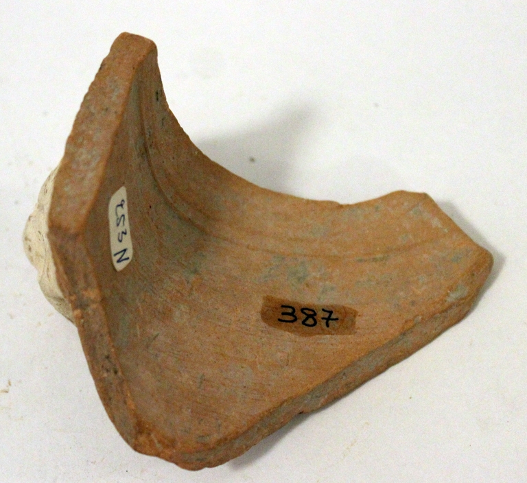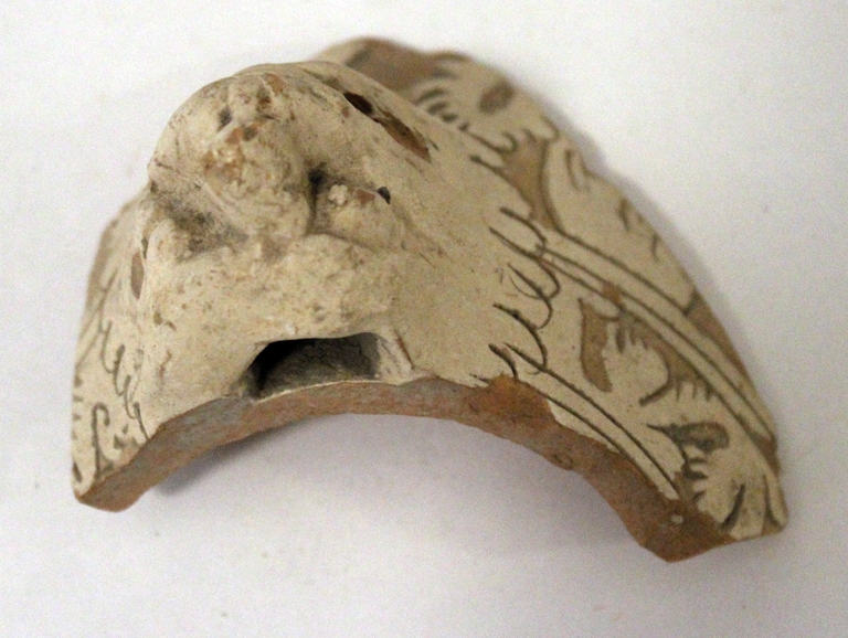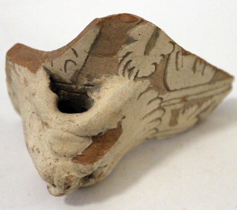 Frammento di fiasca con corpo sferoidale ed ansa zoomorfa a protome leonina. Due fasce con motivi vegetali. Protome leonina a rilievo plastico.