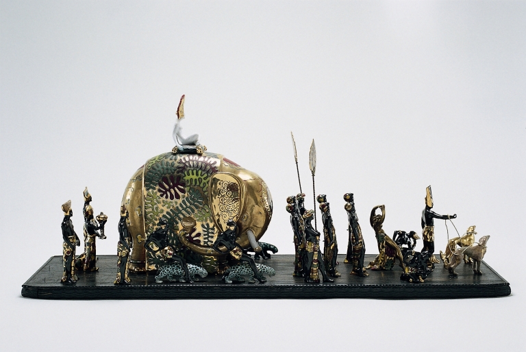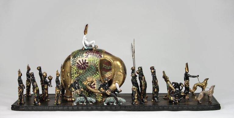 Gruppo plastico composto di venticinque sculture: elefante con sovrapposta bajadera accosciata, due portatori di flabelli, sei danzatori e tre danzatrici, un portatore d'incenso, quattro danzatori con leopardi, quattro guerrieri con scimitarre, un guerriero con alto elmo, due cani.