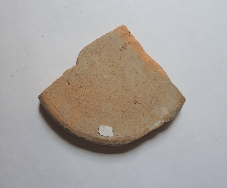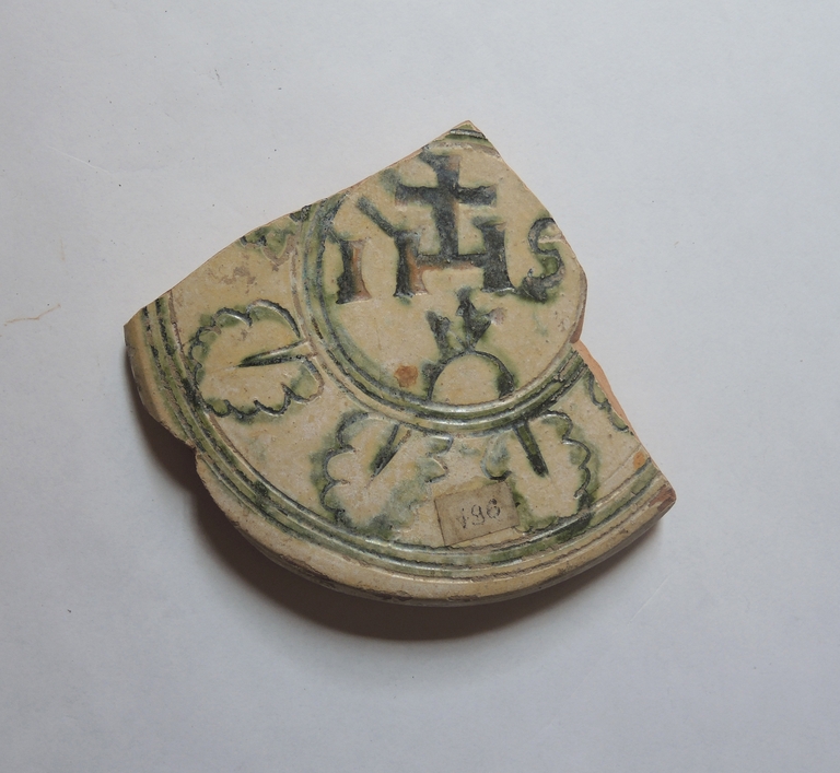Frammento di targa devozionale di forma circolare, piatta ad orlo arrotondato. Nella fascia esterna corona di foglie polilobate; al centro, entro medaglione, monogramma di San Bernardino.