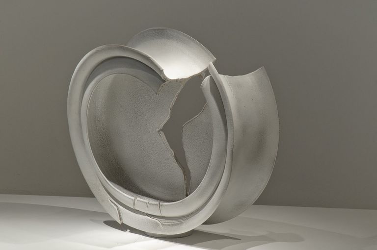 Scultura in grès e smalto "Bianco Zauli", a forma di grande ruota con una lunga frattura centrale che ne provoca una lieve torsione rispetto al suo asse. Sotto la base si trova la firma dell'artista.