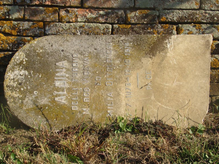 Aldina Vigevani, nata il 27 luglio 1879 e morta il 13 ottobre 1914, era figlia di Marco Vigevani (1837-1914) e di Emilia Ottolenghi (1837-1906), entrambi sepolti in questo cimitero.