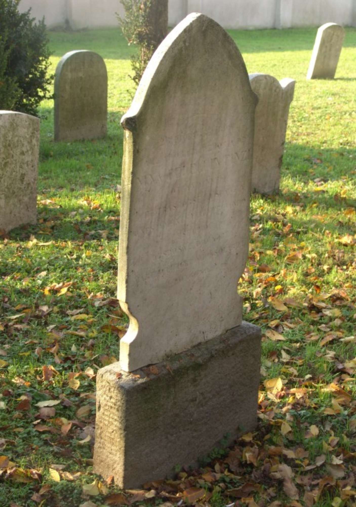 Lapide semplice verticale su piedistallo, con lastra smussata lateralmente nella parte bassa, sommità con mensole aggettanti e coronamento a ogiva, bordo inciso, foro di natura antropica sullo spigolo superiore.