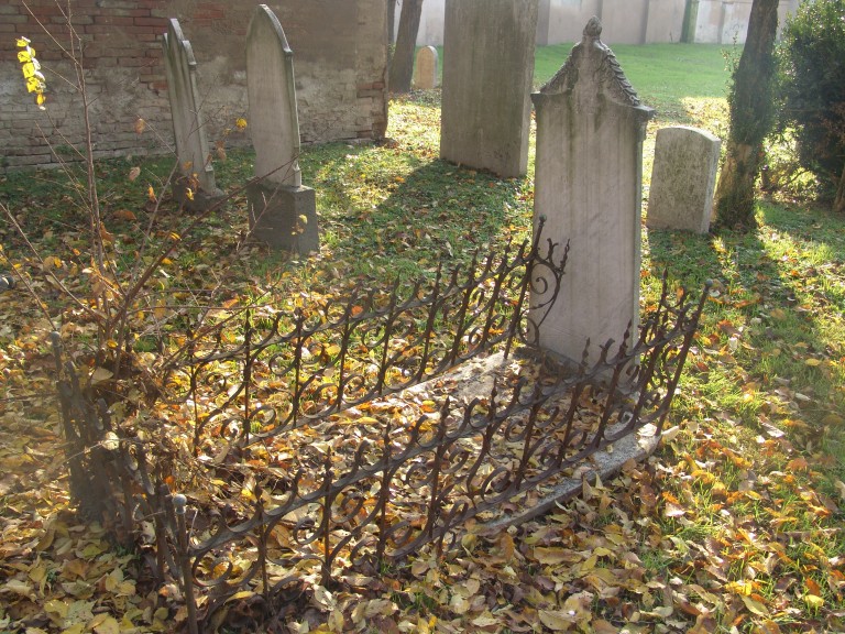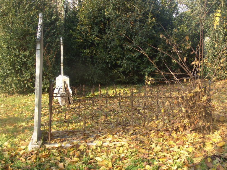 Lapide semplice verticale su piedistallo, con lastra leggermente svasata, mensole aggettanti e timpano con urna con fiamma in sommità; davanti, lastra interrata con recinto metallico lavorato. Decorazione: bassorilievo a motivo floreale lungo i lati del timpano; bassorilievo con urna con fiamma nel timpano; incisione con sole alato in basso al centro.