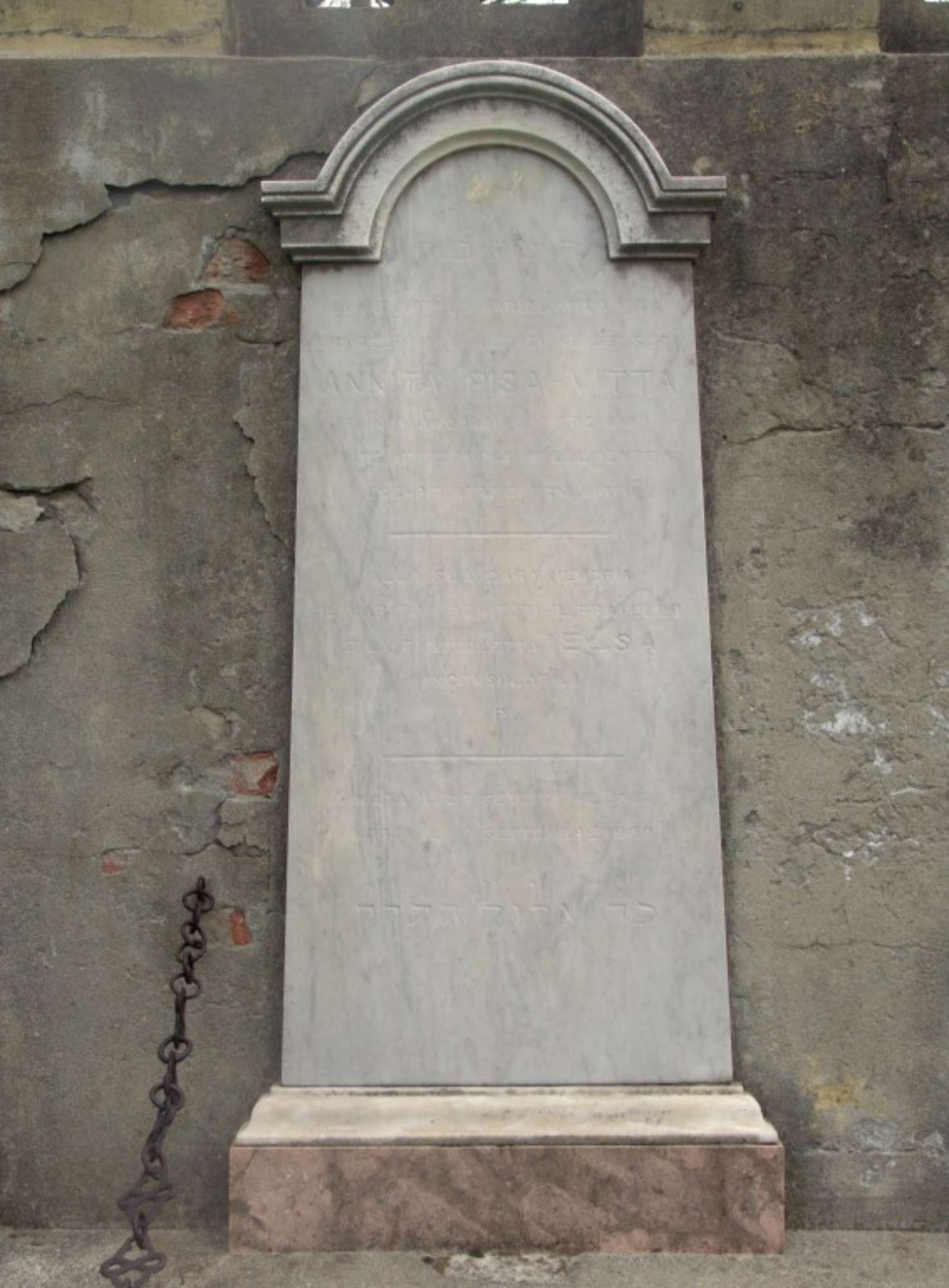 Trascrizione: QUANDO PIU' LE ARRIDEVA LA VITA / ERA TOLTA ALL'ADORAZIONE DEI SUOI / ANNITA PISA – VITTA / DI NON ANCOR VENTITRE' ANNI / MITE AFFETTUOSA INTELLIGENTE / ESEMPIO DI OGNI VIRTU' / ALLA SUA CARA MEMORIA / IL MARITO I GENITORI IL FRATELLO / E LA FIGLIUOLETTA ELSA / INCONSOLABILI / P. / NATA IL 27 SETTEMBRE 1877 / MORTA IL 19 SETTEMBRE 1900