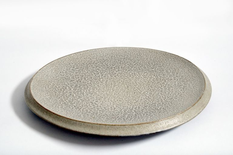Grande piatto in grès con smalto "bianco Zauli"e bordo rialzato in uno spigolo vivo, databile alla seconda parte degli anni '60.