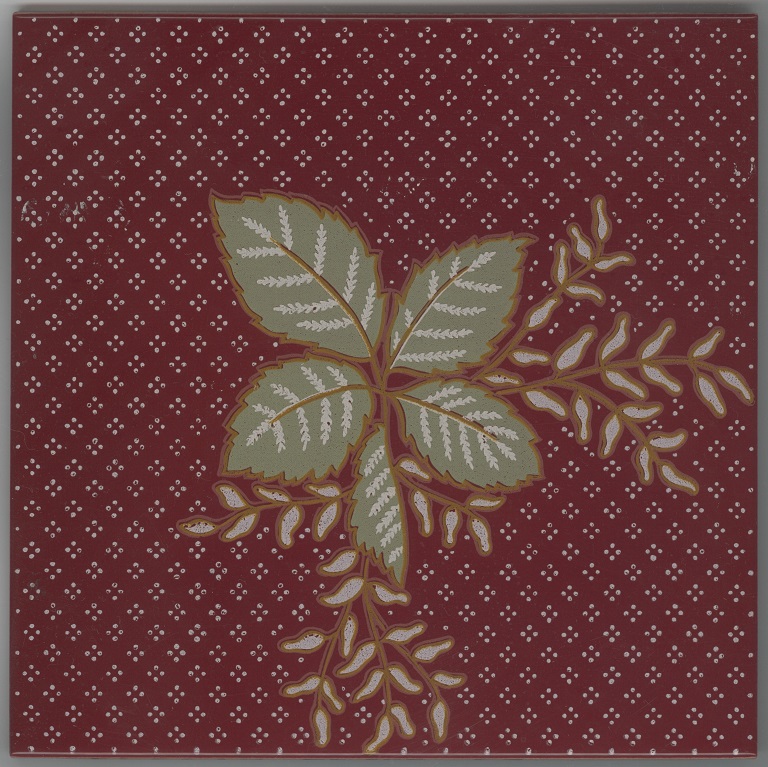 Piastrella della serie "Collezione Valentino, linea "Cina", composta da 5 elementi, modello "Foglia rosso". Caratterizzata dallo smalto di fondo rosso lucido con decoro floreale per serigrafia a quattro colori. Sul retro impresso “CCV (ceramica Castelvetro) | made in Italy” e “18.4.90 | T. 3 P7”, a pennarello “rif. n. 2”, presente etichetta “V | Valentino | ceramiche | Piemme (entro cartiglio) | bicottura cm. 20X20 | collez. Valentino | linea Cina | art. foglia rosso | (produz. 1982\1992)”.