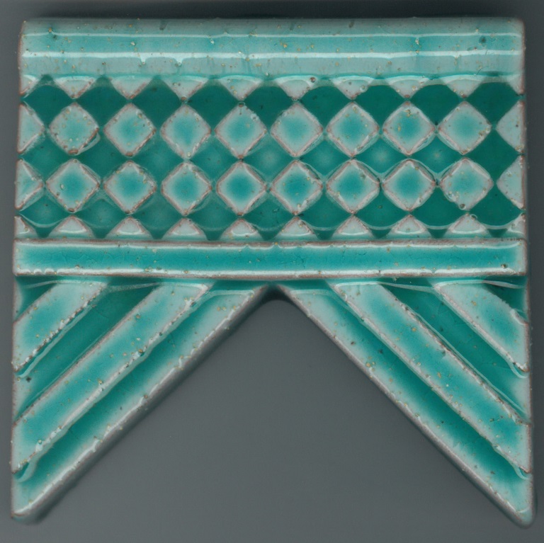Listello speciale per cornice della serie "Fregi", strutturato e foggiato per pressatura allo stato semi plastico con motivi geometrici, fondo bianco e aspersione di vernice verde.
