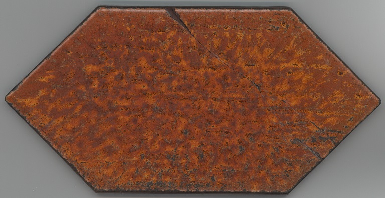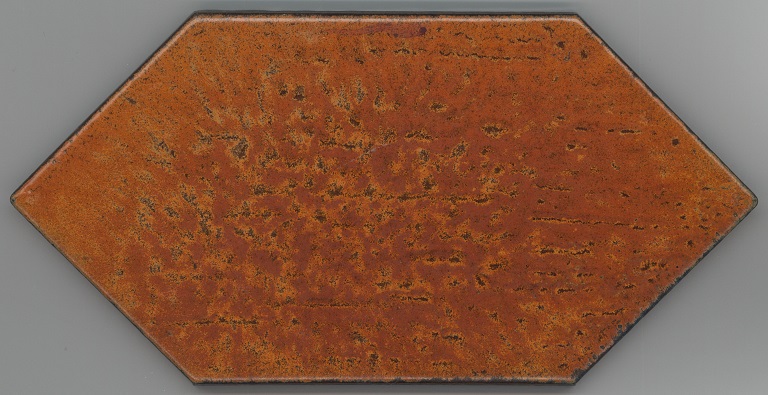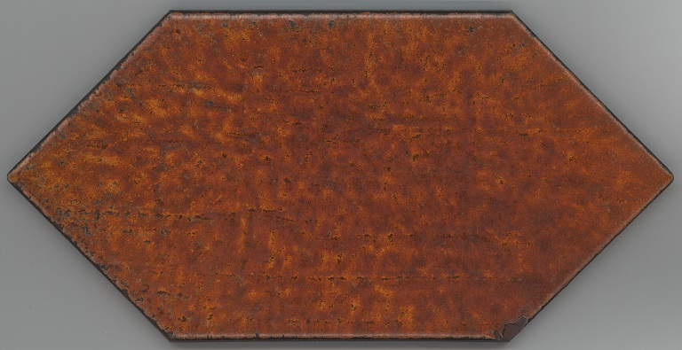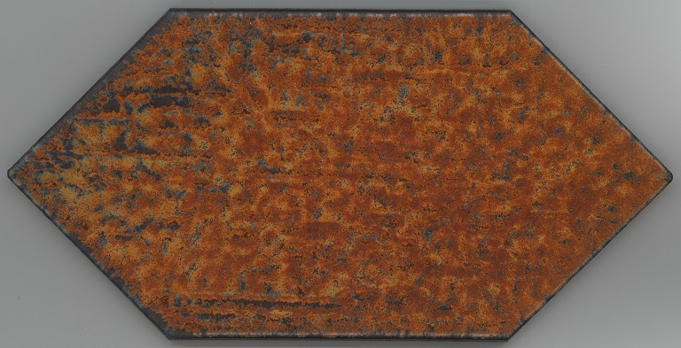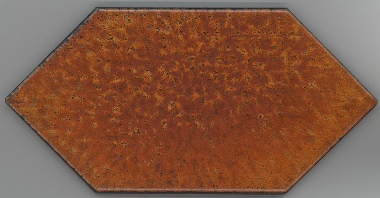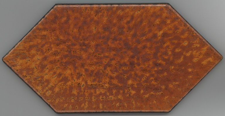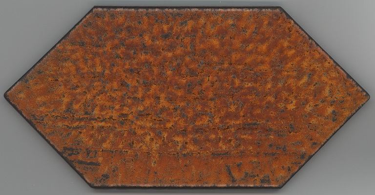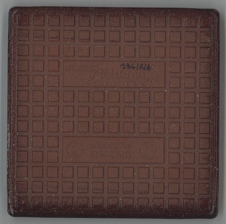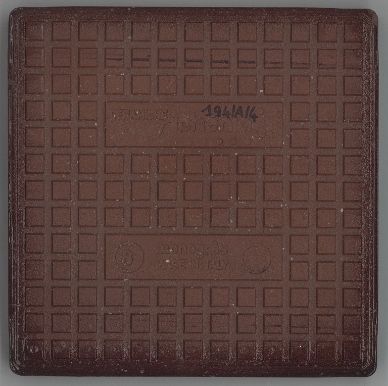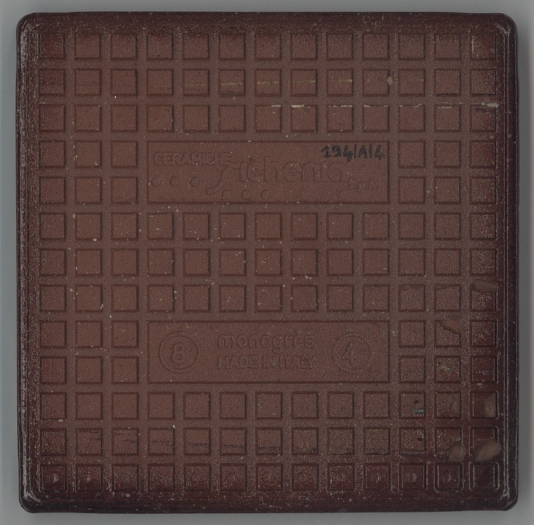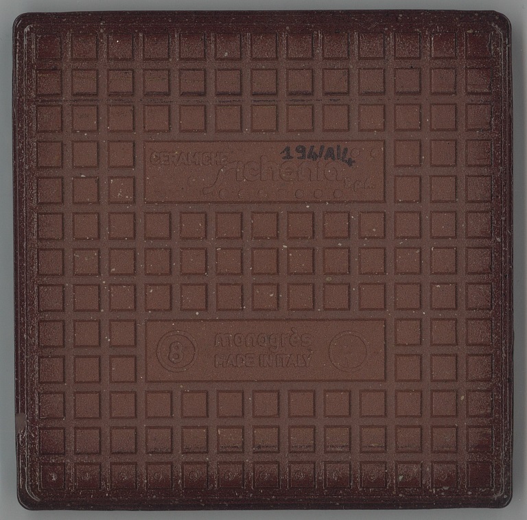 b: piastrella a losanga dal supporto strutturato con linee in bassorilievo, la smaltatura è stata fatta con applicazioni a disco di smalti che cristallizzano in cottura, effetto cuoio. Sul retro di una impresso “ceramiche | Sichenia | s.p.a." e "8 (entro cerchio) monogres | made in Italy 6 (entro cerchio)". Sul retro di due impresso “ceramiche | Sichenia | s.p.a. | (sei pallini)" e "8 (entro cerchio) monogres | made in Italy 6 (entro cerchio)". Sul retro di due impresso “ceramiche | Sichenia | s.p.a. | (due pallini)" e "8 (entro cerchio) monogres | made in Italy 6 (entro cerchio)". Sul retro di due impresso “ceramiche | Sichenia | s.p.a. | (tre pallini)" e "(quattro pallini) (cerchio) monogres | made in Italy 84 (entro cerchio)". Sul retro di due impresso “ceramiche | Sichenia | s.p.a. | (sei pallini)" e "(quattro pallini) (cerchio) monogres | made in Italy 84 (entro cerchio)". Sul retro di due impresso “ceramiche | Sichenia | s.p.a. | (quattro pallini)" e "(cinque pallini) (cerchio) monogres | made in Italy 84 (entro cerchio)". Sul retro di una impresso “ceramiche | Sichenia | s.p.a. | (tre pallini)" e "8 (entro cerchio) monogres | made in Italy 6 (entro cerchio)".