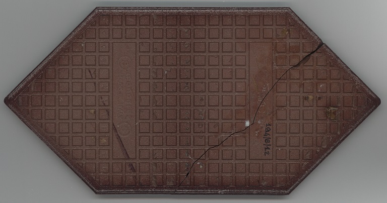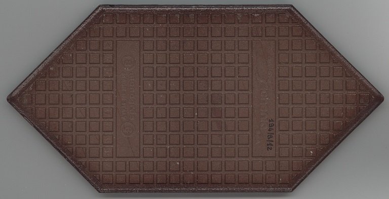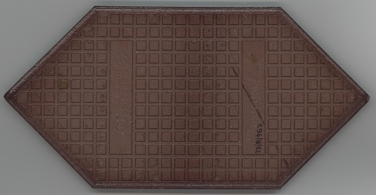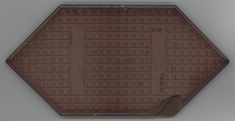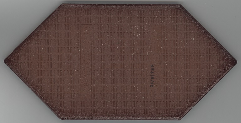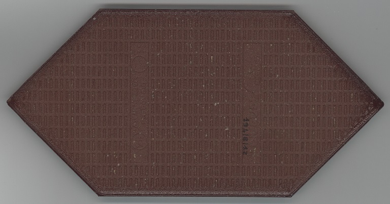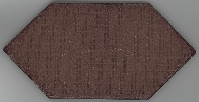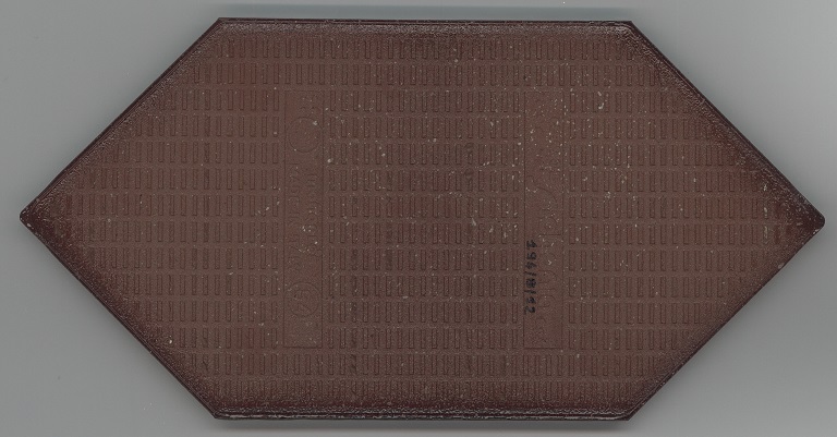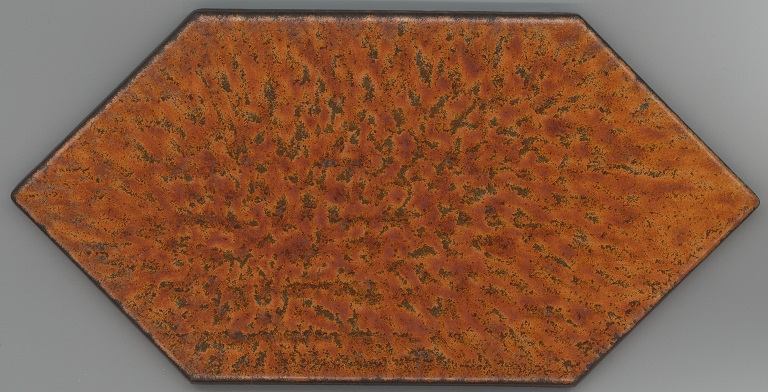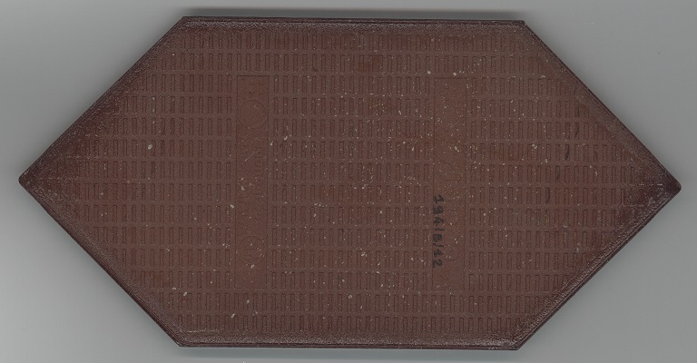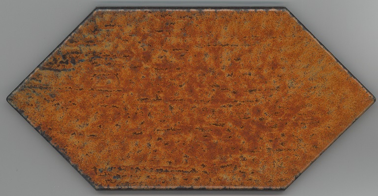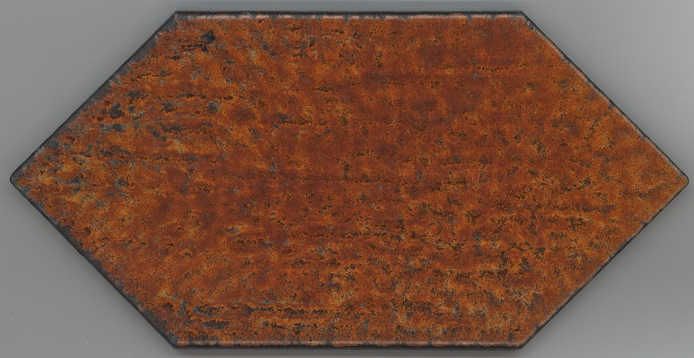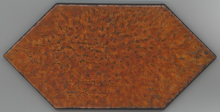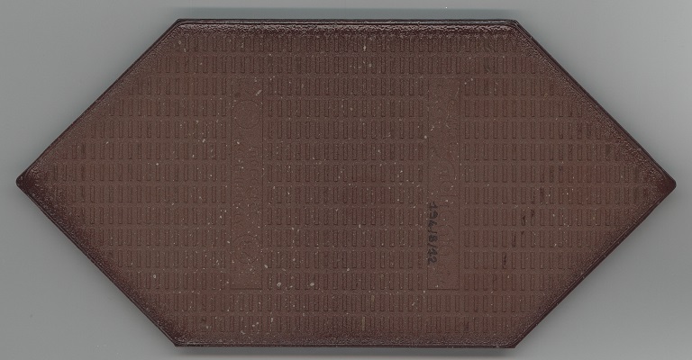 b: piastrella a losanga dal supporto strutturato con linee in bassorilievo, la smaltatura è stata fatta con applicazioni a disco di smalti che cristallizzano in cottura, effetto cuoio. Sul retro di una impresso “ceramiche | Sichenia | s.p.a." e "8 (entro cerchio) monogres | made in Italy 6 (entro cerchio)". Sul retro di due impresso “ceramiche | Sichenia | s.p.a. | (sei pallini)" e "8 (entro cerchio) monogres | made in Italy 6 (entro cerchio)". Sul retro di due impresso “ceramiche | Sichenia | s.p.a. | (due pallini)" e "8 (entro cerchio) monogres | made in Italy 6 (entro cerchio)". Sul retro di due impresso “ceramiche | Sichenia | s.p.a. | (tre pallini)" e "(quattro pallini) (cerchio) monogres | made in Italy 84 (entro cerchio)". Sul retro di due impresso “ceramiche | Sichenia | s.p.a. | (sei pallini)" e "(quattro pallini) (cerchio) monogres | made in Italy 84 (entro cerchio)". Sul retro di due impresso “ceramiche | Sichenia | s.p.a. | (quattro pallini)" e "(cinque pallini) (cerchio) monogres | made in Italy 84 (entro cerchio)". Sul retro di una impresso “ceramiche | Sichenia | s.p.a. | (tre pallini)" e "8 (entro cerchio) monogres | made in Italy 6 (entro cerchio)".