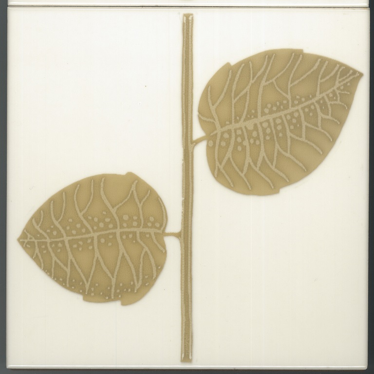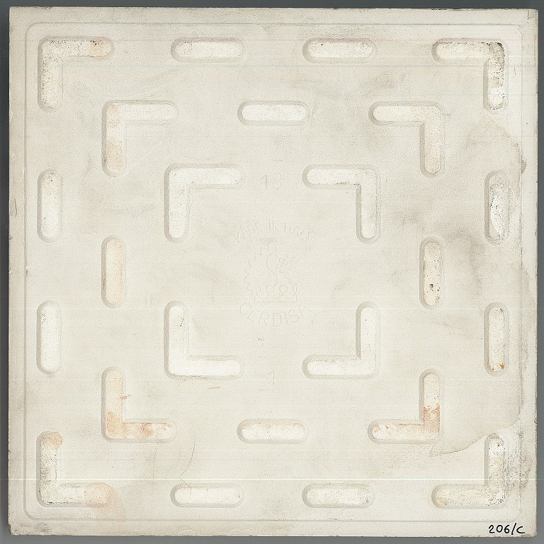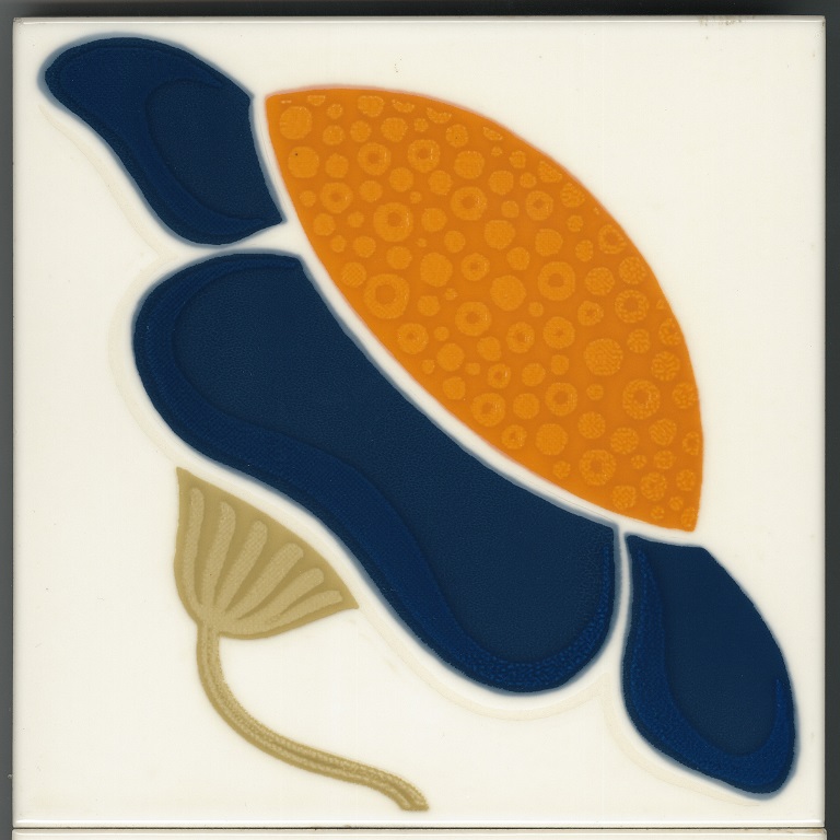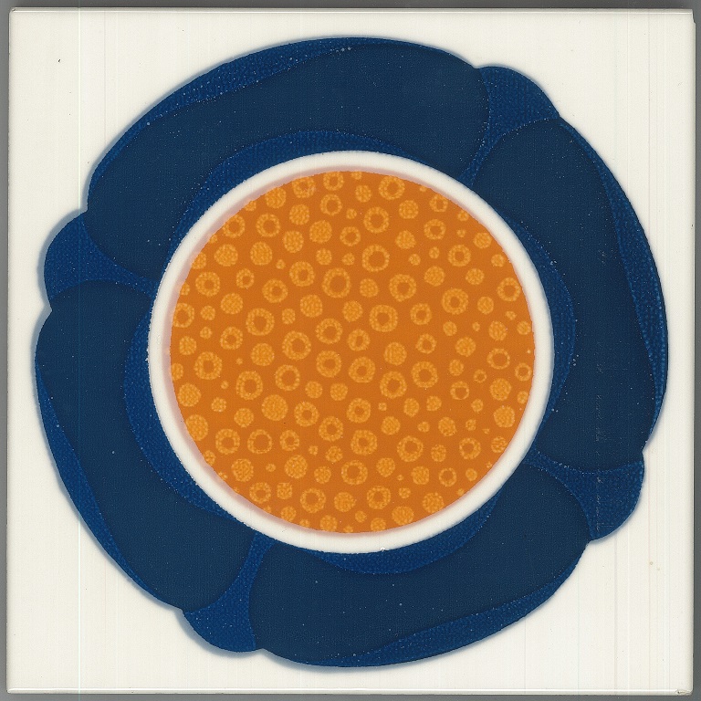 a, b: decorate con la tecnica della serigrafia a riserva in quattro colori e smaltate di bianco lucido. Le due piastrelle compongono il motivo di un fiore stilizzato. Montate su pannello di faesite;