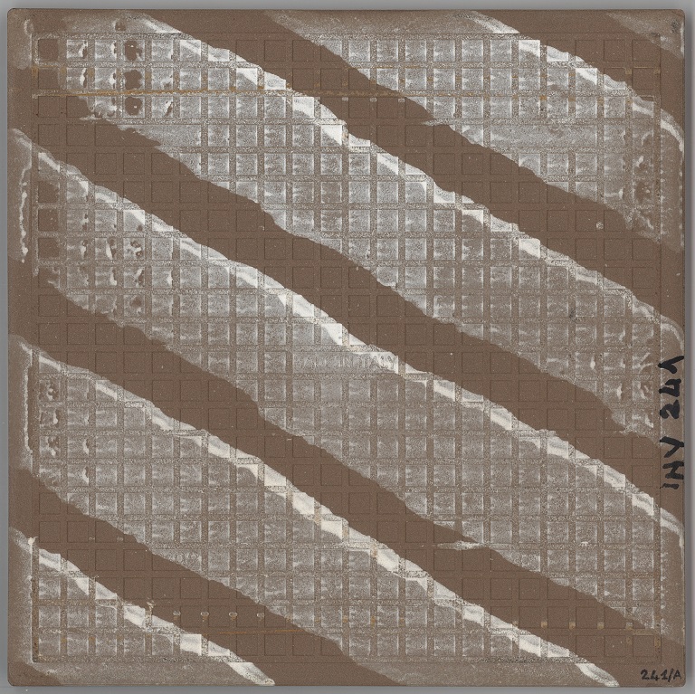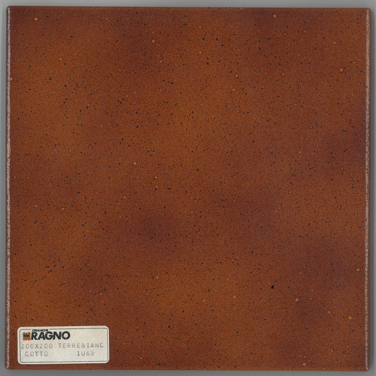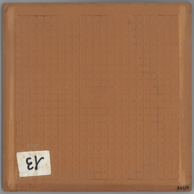 a: piastrella modello "Cotto" ad imitazione del cotto toscano con il supporto che simula la spazzolatura. Rivestimento con smalto zavorrato e fiammatura ad effetto cuoio. Sul fronte presente etichetta “ceramiche | (marchio azienda) Ragno | 200×200 Terrebianc | Cotto 1U63”. Sul retro impresso “made in Italy" e "2 92 3”, a pennarello "inv. 241";