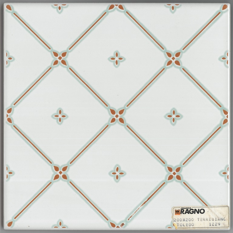 b: piastrella modello "Toledo" dallo smalto di fondo bianco lucido con decoro geometrico\floreale serigrafico a due colori, bruno e turchese affondante. Sul fronte presente etichetta “ceramiche | (marchio azienda) Ragno | 200×200 Terrebianc | Toledo 1Z29”. Sul retro impresso “made | in |Italy" e "T. 3 | P. 4”, presente etichetta numero “13”.